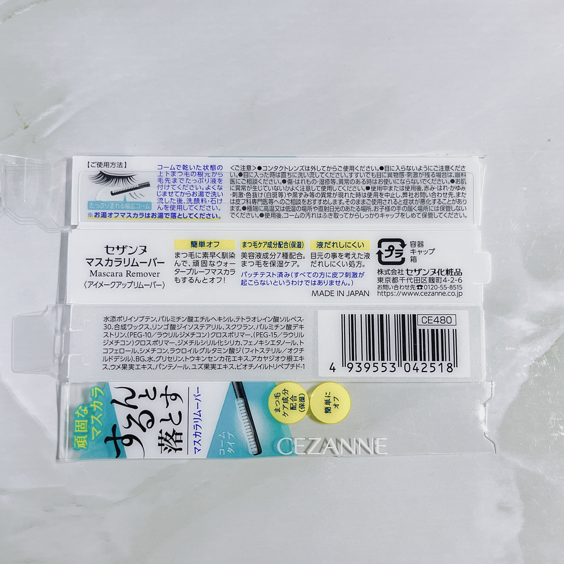- まつ毛に素早く馴染んで、頑固なウォータープルーフマスカラもするんと落とせます。 セザンヌのウォータープルーフマスカラとフィルムタイプ(お湯オフタイプ)のマスカラ全てに使用できます。 目元のことを考えた液だれしにくい処方。 美容液成分7種(ユズ果実エキス、パンテノール、ビオチノイルトリペプチド-1、ウメ果実エキス、ラウロイルグルタミン酸ジ(フィトステリル/オクチルドデシル)、アカヤジオウ根エキス、トウキンセンカ花エキス)配合。 まつ毛にたっぷり塗れる幅広コームを採用。