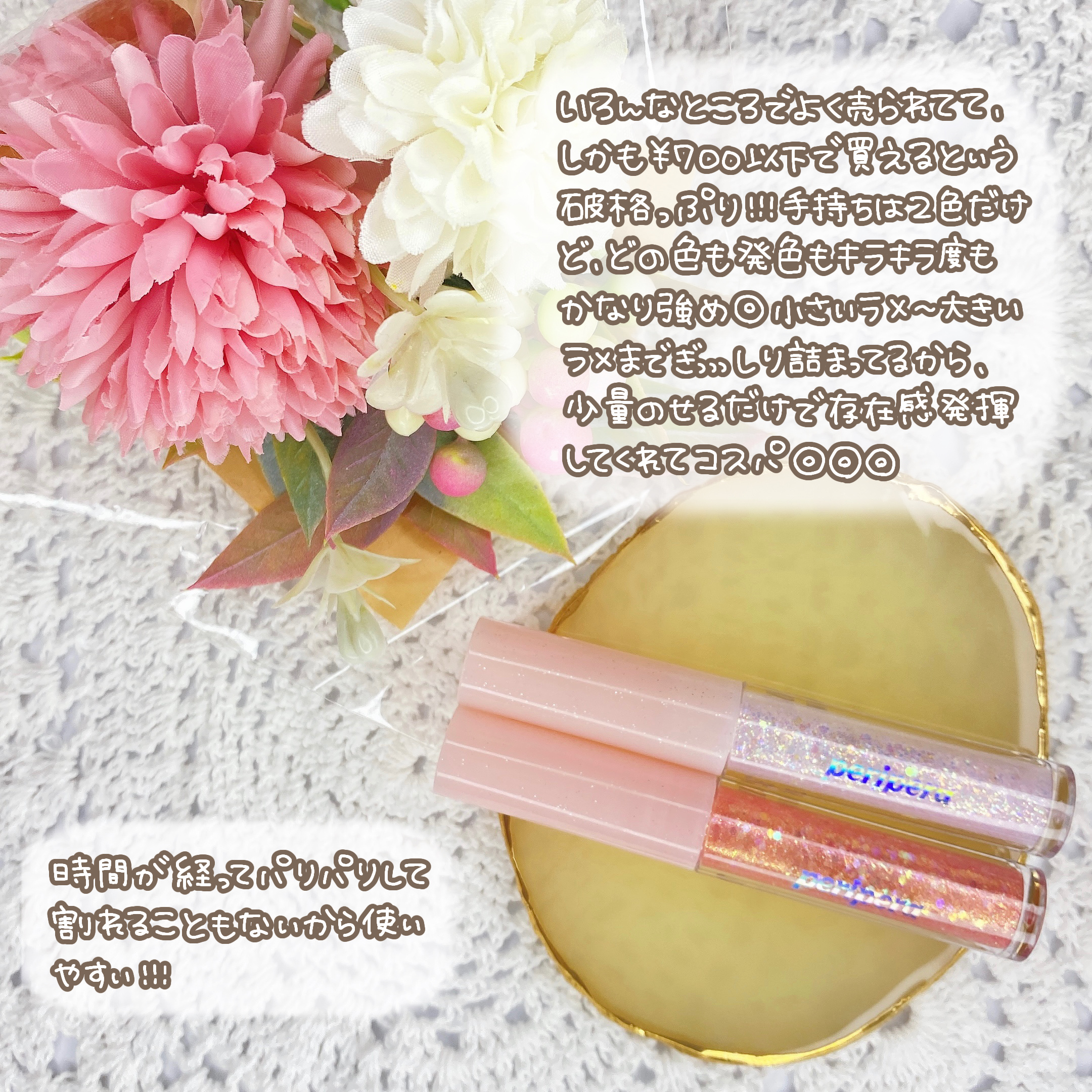 periperaのリキットグリッターアイシャドウ。 全3色の内01番を購入 660円と驚愕のコスパで手が出しやすいと思います。 リキットなだけありなかなか水っぽいです。 ラメの密度も低めに感じました。 ラメの大きさは大きめで、あとはきめ細かな小さいラメ達がありますが、個人的には少し付けにくいと思いました 涙袋の黒目下に大きめラメを入れるとキラキラしてかわいいと思います。 このきらびやかさが660円で買えるのは破格だと思います。