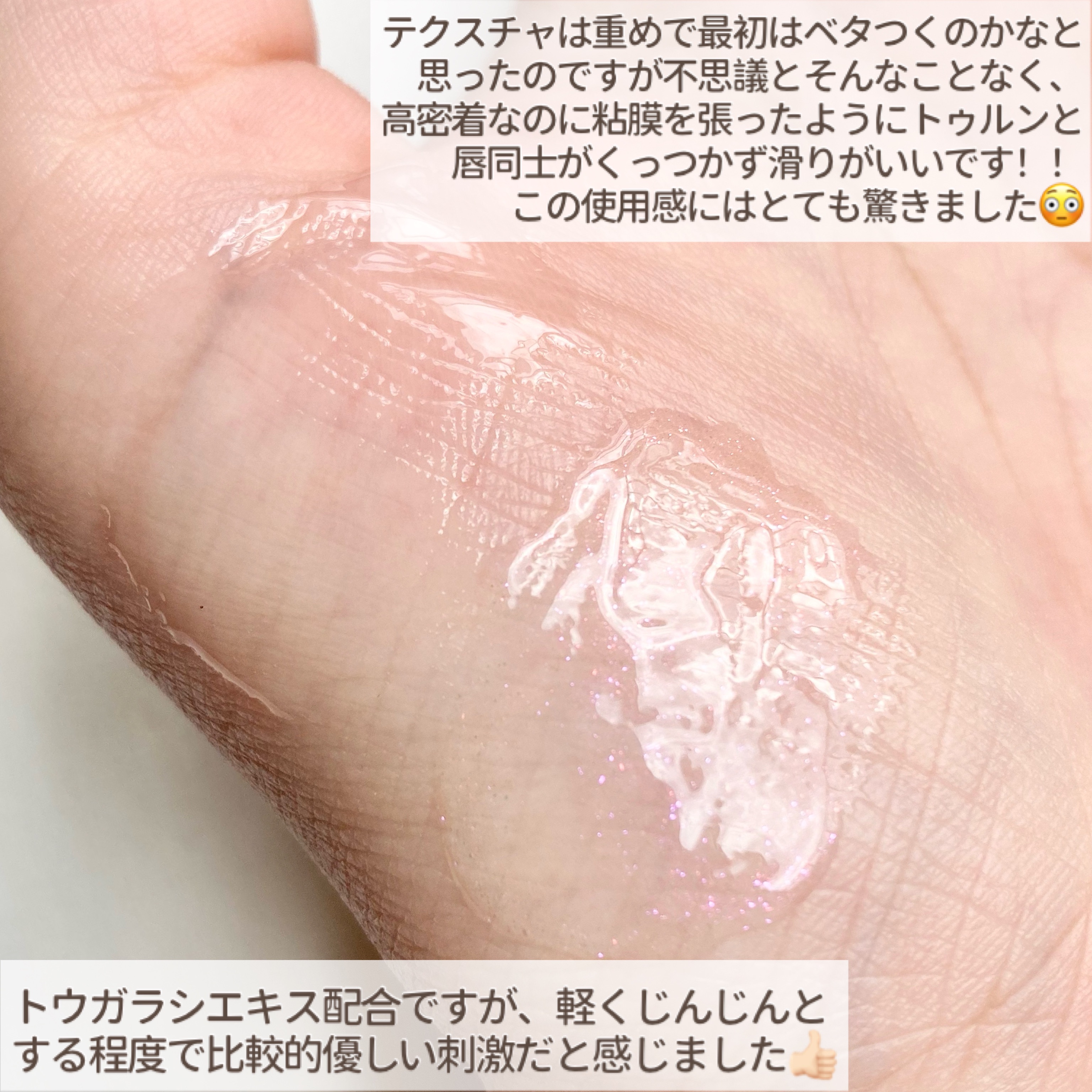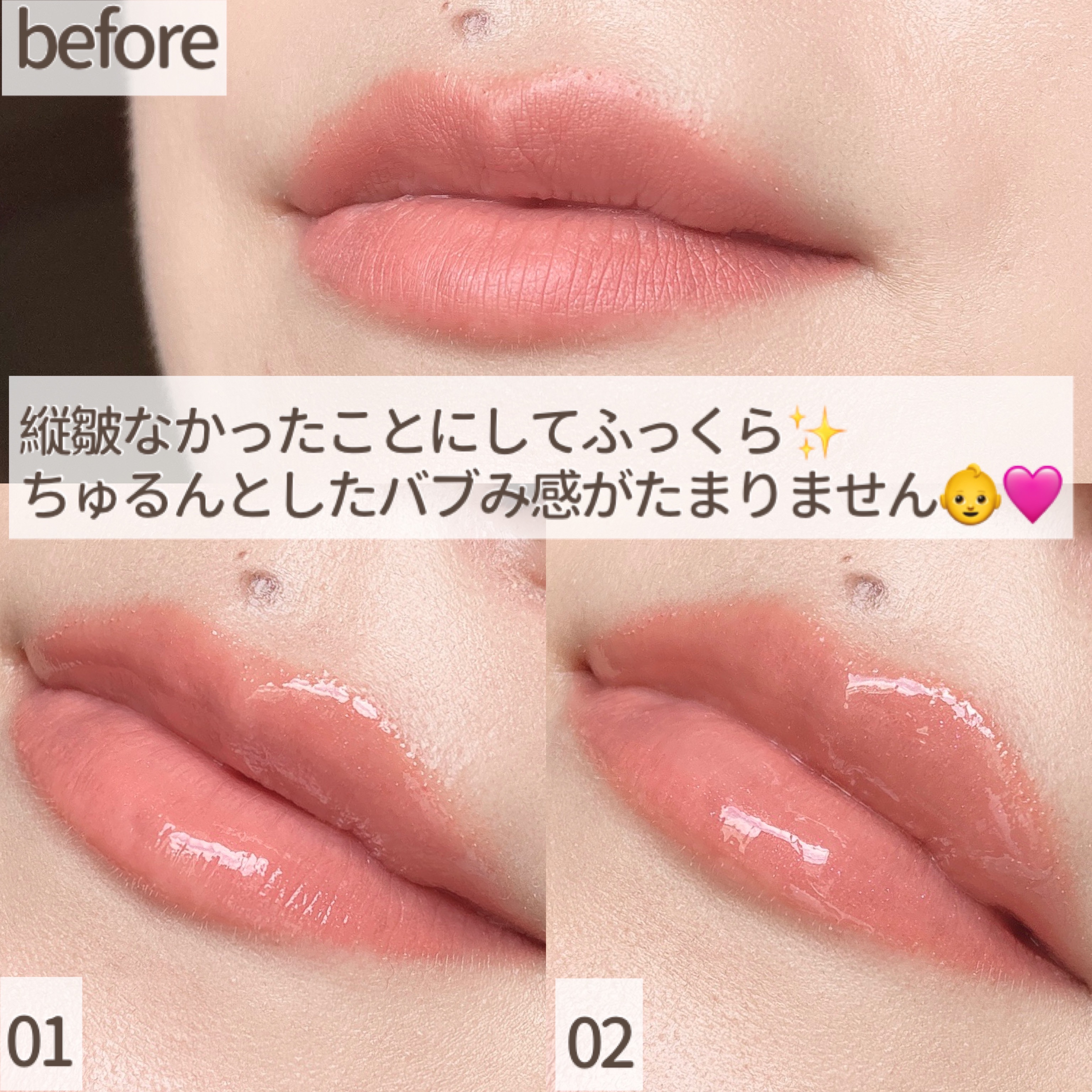 トウガラシエキス配合で程よいピリピリ感のプランパー。 縦皺が目立ちにくくふっくらとしたハリが出てくれる。 保湿感が高くとろみのあるテクスチャーが 立体感がありちゅるちゅるとした唇に見せてくれる◎ 01〜03はシリコンスパチュラタイプで 他のリップの上から重ねても拭き取りやすく衛生的! 04は液含みが良くしなりの良いアプリケータータイプ!