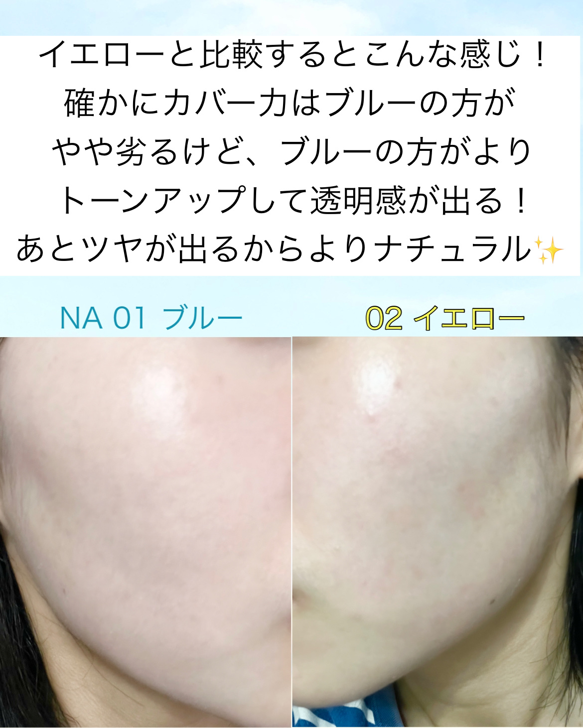 今回の新色!既存色2色より若干液が柔らかい! ・1番トーンアップして透明感が出る! しかも元からこの肌です感😂 ・シルバーパールが入っててナチュラルなツヤが出る! ・他より伸びがやや良くてみずみずしい✨ ピンクベージュのようなカラーで、 ・血色感が出る ・1番ナチュラル ・肌トラブルが少ない人にオススメ 迷ったらこれ買って欲しい!! ・カバー力1番高くて赤みが消える ・1番厚塗り感は出るから塗る量注意⚠️ ・肌トラブル多い人にオススメ ✅トーンアップしたい人 ✅透明感が欲しい人 ✅ナチュラルなツヤが好きな人(マット派さんも◎) ✅カバー力が欲しい人(ピンク、イエローには劣る)