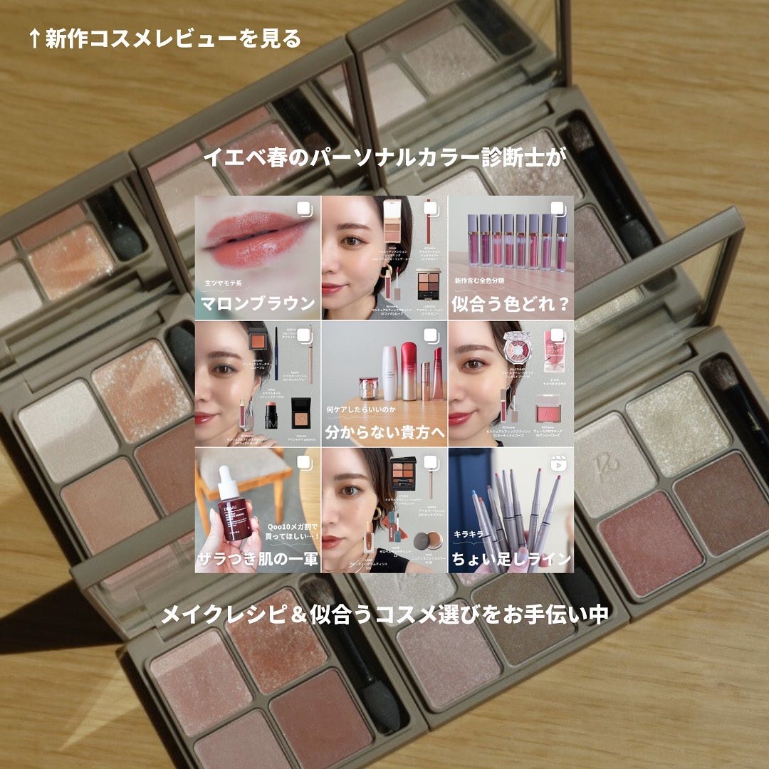 粉質がとにかくしっとり…!デパコスで感じるやつ…! どのパレットもブラウンベースで普段使いしやすいカラー展開です。 オレンジベースにシルバーラメが混ざっていたり コーラルベースにローズピンクやココアブラウンが混ざっていたり! あまり偏らずに使えるのがこれまた好きなポイントっ🫶 かっこいい雰囲気ならウインターグレイ、女性的な雰囲気ならティーローズ、大人っぽいならイノセントピーチ、カジュアルならオレンジアーモンド パーソナルカラー分からないよ〜という方は 過去投稿に似合うコスメを選ぶポイント上げているのでやってみてね🥰