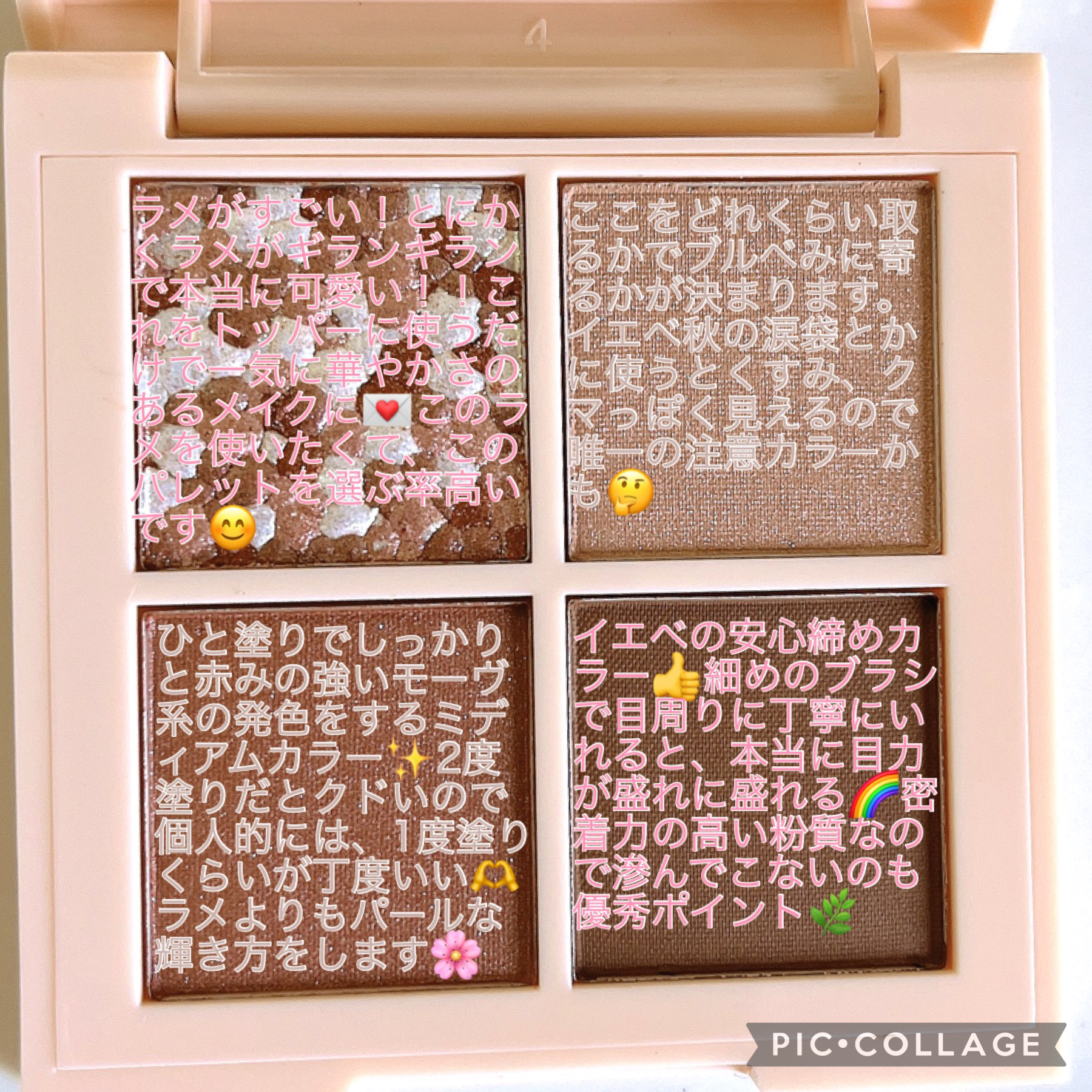 赤みブラウンって感じなのかな。ほんのりパープルとピンクの混ざったような絶妙なカラーが可愛くカッコよく仕上がります。 くすみ色だけど、ラメがめちゃくちゃキレイでパッと映えるので、仕上がりの好みによって印象をチェンジできちゃう♫ 4色だけど満足度の高いアイシャドウです❤️