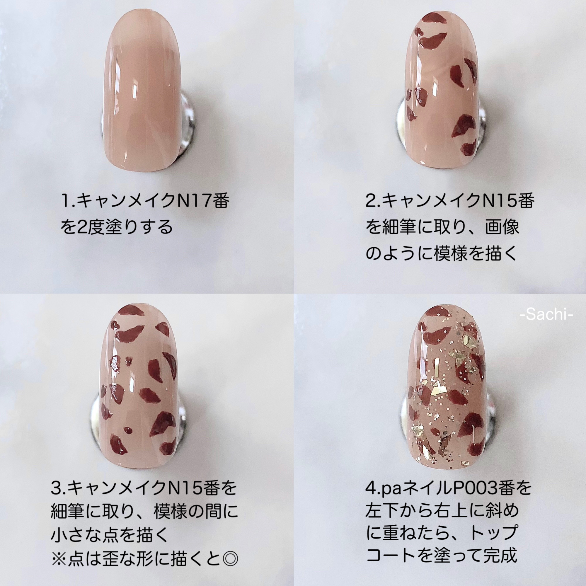 ワンカラーでも指ごとに色を変えるだけでオシャレに見えます💕 画像のようにゴールドラインとストーンを少し足すだけで華やかさがアップ🥰 何度かご紹介したことのあるスポンジで作るグラデーションです✨ スポンジを使うことで境目が綺麗に馴染んでくれます💕 アルミホイルの上でブラウンとトップコートを1:1くらいで混ぜたものを、トップコートのハケに取って3箇所に塗るだけ👌 事前に混ぜたものを塗ることで、爪の上でぼかすより簡単に出来ます💕 ベースカラーが乾く前に点置きしてぼかすことで綺麗にぼかせます✨ スピードが大事なので、使うポリッシュのキャップは全て開けておきましょう😊 天然石のラインはガタガタの方がより天然石っぽく見えるので、ラインを描くのが苦手な方でも大丈夫🙆♀️ 難しそうに見えて、やってみると意外と簡単に出来ます♡