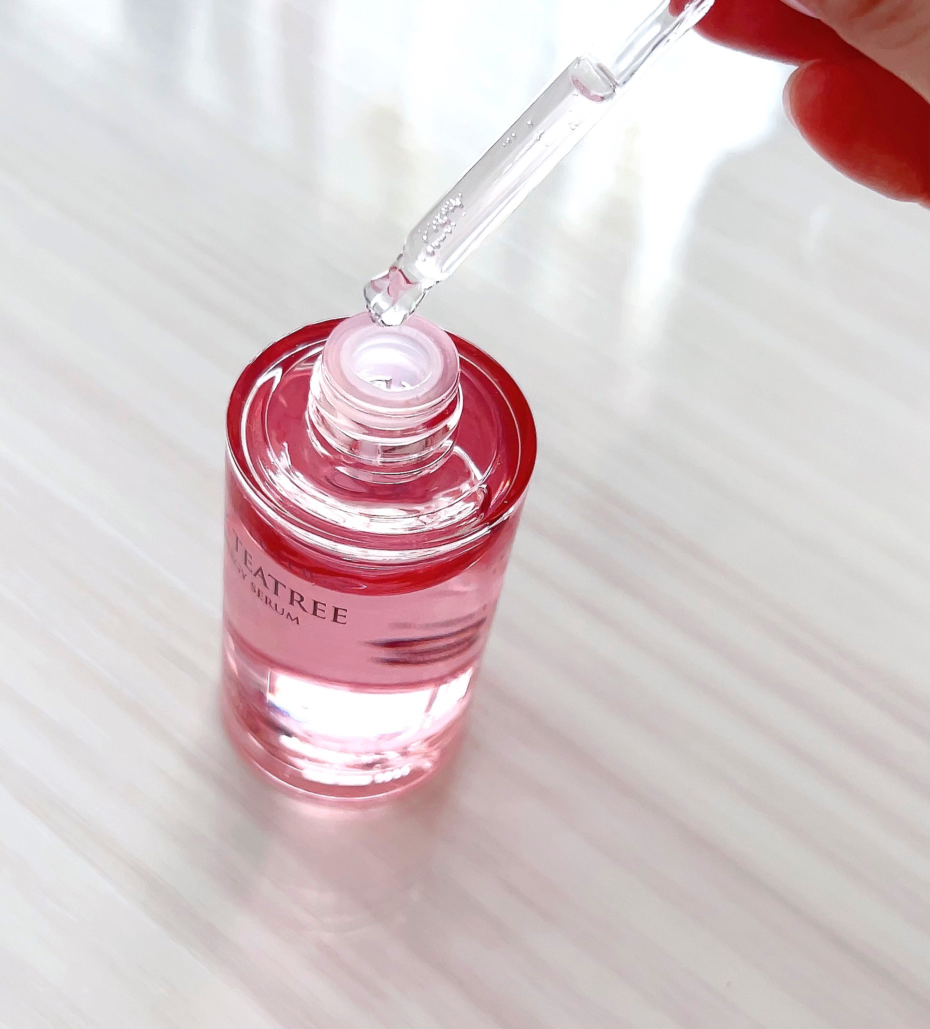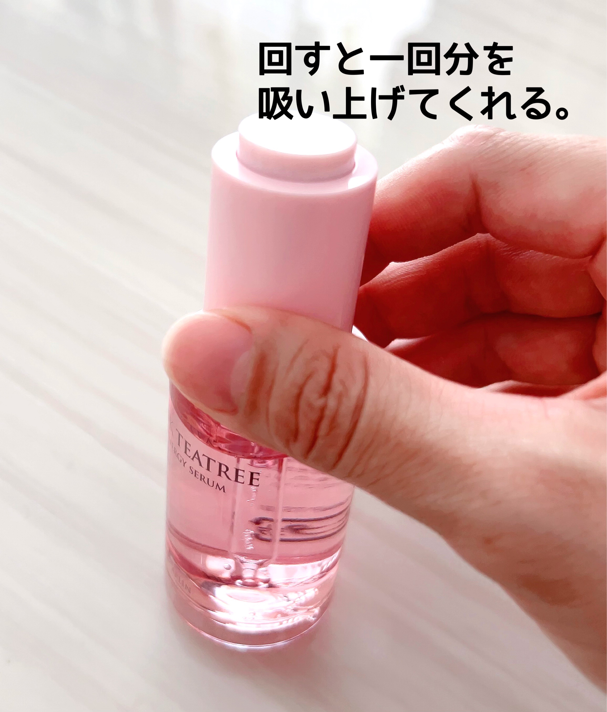 APLINの『ピンクティーツリーシナジーセラム』はティーツリーとシカエキス配合のニキビ・肌荒れ悩みをケアしてくれる美容液💗 このピンクカラーは人口色素を一切排除し原料本来のビタミンB12成分のカラーで、荒れた肌に水分と活力を与えお肌の調子を整えてくれます❣️ キャップを回すと自動的に一回分のセラムがスポイトに吸い上げてくれるので、量を調節したりせずとっても便利✨
