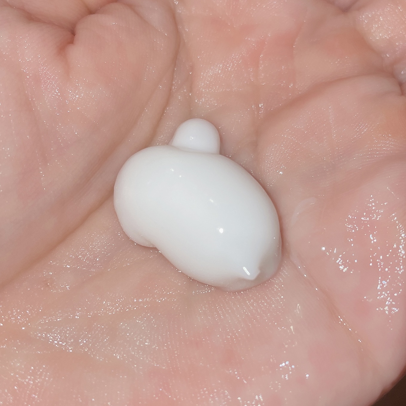 使用目安2、3プッシュとありますがピンポイントで特にケアしたい部分(例えば、鼻・小鼻・上瞼や下瞼周辺・頬付近三角ゾーン・顎・おでこにちょんちょん)全てにそれぞれ丁寧に塗り込むには、のびがいいので1プッシュでも充分に足りるくらい。 最初押し出した時は形が崩れないぷるんとした柔らかめのジェリー状のような雰囲気。 指で伸ばすと とぅるんとなめらかにのびて、馴染ませると手と肌がぴたっと吸い付くような潤い感。 香りが強くないのに、さり気ない爽やかな清潔感のある香りがほんのりするところもすごく好みです。