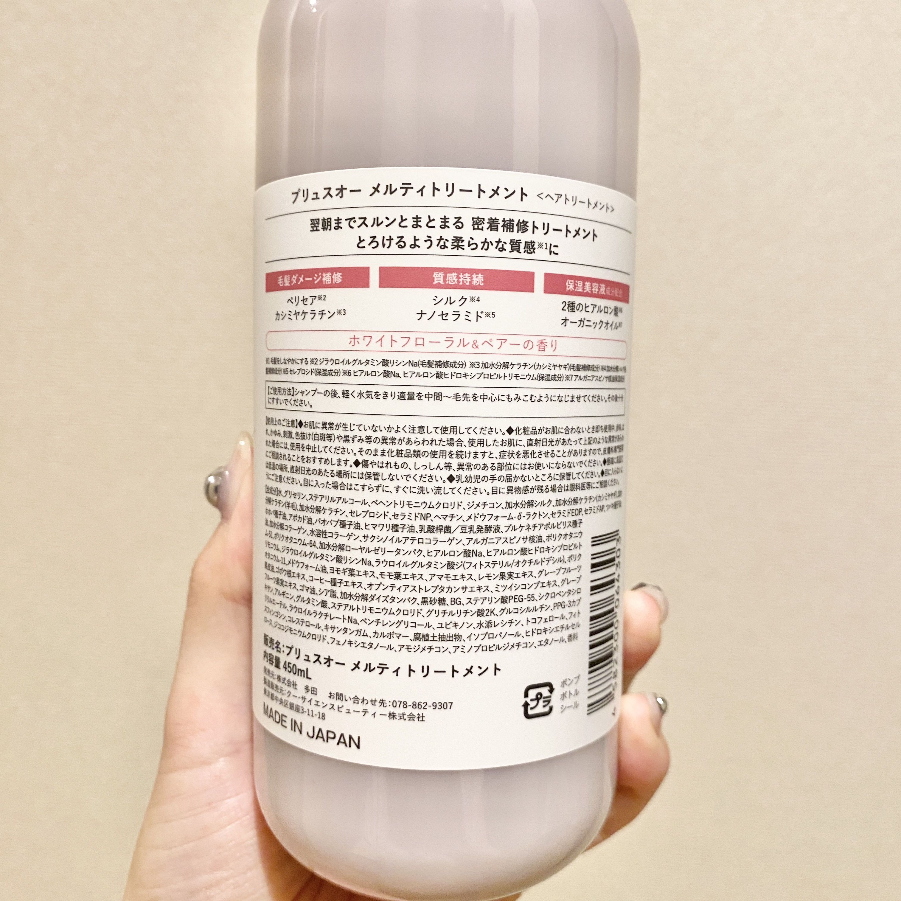 - とろけるような質感と、うねり・広がりやすい髪も毛先まで柔らかにスルンとまとまるツヤ髪へ導く美容液シャンプー&浸透補修トリートメント。 洗いながらも髪ダメージを補修するコラーゲン由来とケラチン由来の2種のPPT系洗浄成分、肌のことを考えてアミノ酸系の3種の洗浄成分をバランスよくブレンド。 キメ細かな濃密補修泡が摩擦レスでリッチな洗い心地を実現し、髪と頭皮をいたわりながらシャンプーでも毛髪ダメージに徹底アプローチします。 カシミヤ由来のケラチンをはじめとする3種のケラチン、シルクPPT&コラーゲンPPT、CMC類似成分などのこだわり配合した補修成分だけでなく、美容保湿成分をたっぷり浸透させて密封補修することで、カラーや熱ダメージによるパサつき・広がり・ゴワつきなどの蓄積ダメージもしっかりケア。 また、浸透性が高く毛髪内部から水分の蒸発を防ぐナノセラミドをメルティシリーズに新配合。 ペタンと重くならないのに毛先が柔らかにまとまってツヤめく髪へと導きます。 ドライヤーやヘアアイロンの熱ダメージから髪を守りツヤを与える、ヒートリペア成分を配合して熱も味方に。 清楚な上品さを纏うホワイトフローラル&ペア―の香り。 2023/8/10 一部企業にて先行発売