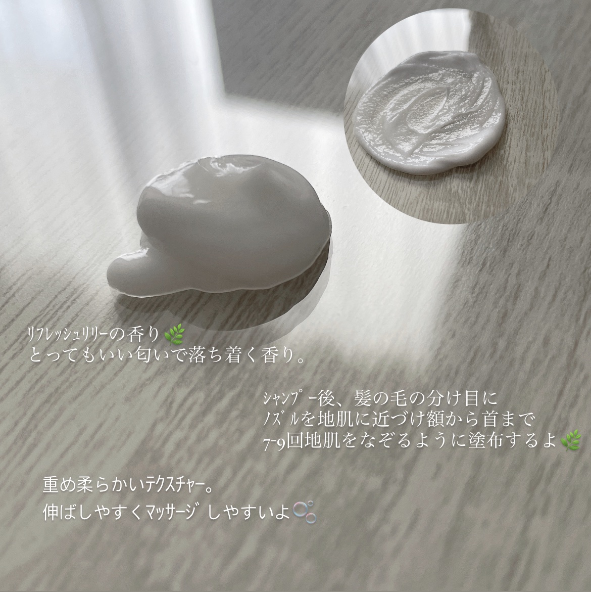 シャンプーの後、髪の分け目にノズルを近づけ額から首の方に向かって7‐9回、地肌をなぞるように塗布します。 こっくりとしたクリームですがなじませやすく、少しスーッとするような使用感が気持ちいいです😊 流すとなんだかスッキリするような♪ 1回で結構な量を使うのと、どのくらいついてるのか分かりにくいのが気になるかな🤔