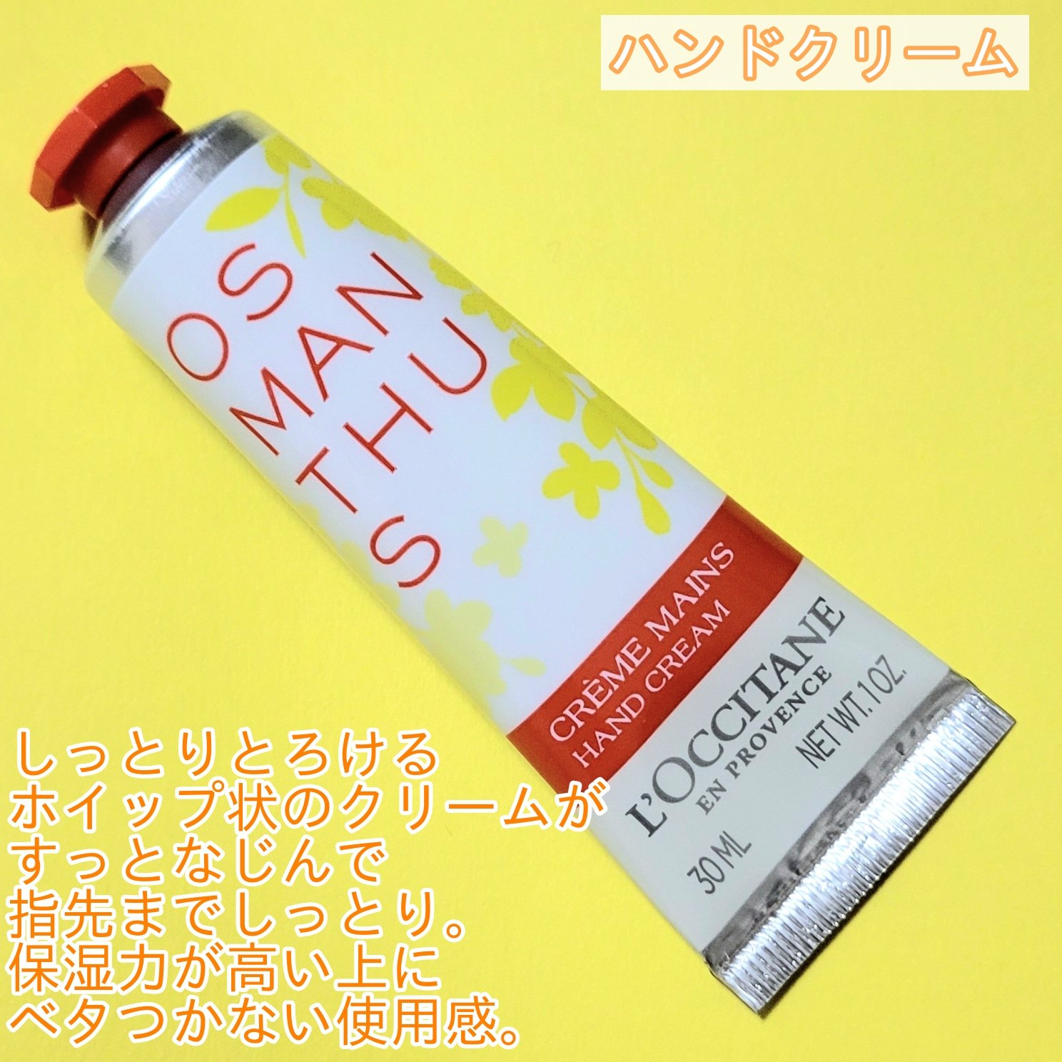 《L'OCCITANE》オスマンサスハンドクリームフルーティーな金木犀の香りがふわっと広がり、甘すぎず爽やかな香りで日中に使用しています!!ロクシタンのハンドクリームの中で一番好きな香り🥺🫶🏻︎💞コンパクトなサイズなのでバッグやポーチに入れて...