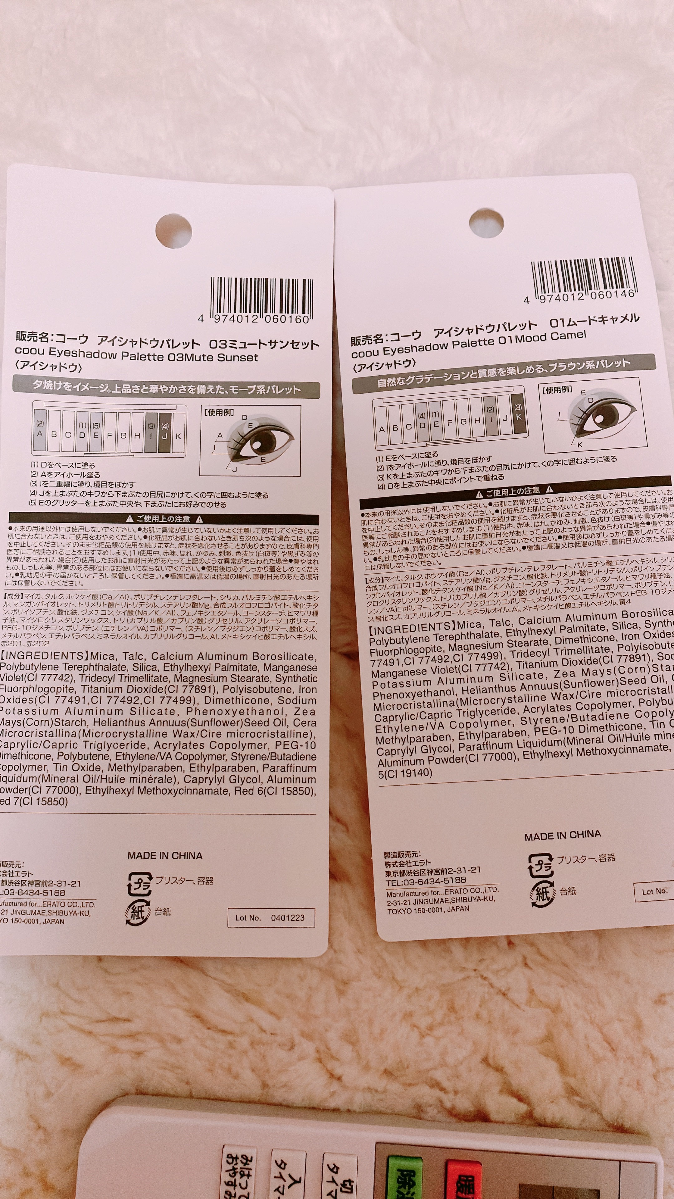 - <02 ドライブーケ> マイカ、タルク、ホウケイ酸(Ca/Al)、マンガンバイオレット、ポリブチレンテレフタレート、パルミチン酸エチルヘキシル、シリカ、ステアリン酸Mg、合成フルオロフロゴパイト、トリメリト酸トリトリデシル、ジメチコン、ポリイソブテン、酸化鉄、酸化チタン、コーンスターチ、ケイ酸(Na/K/Al)、フェノキシエタノール、ヒマワリ種子油、アクリレーツコポリマー、マイクロクリスタリンワックス、トリ(カプリル酸/カプリン酸)グリセリル、PEG-10ジメチコン、(エチレン/VA)コポリマー、ポリブテン、(スチレン/ブタジエン)コポリマー、酸化スズ、メチルパラベン、エチルパラベン、赤201、カプリリルグリコール、ミネラルオイル、Al、メトキシケイヒ酸エチルヘキシル、赤202、黄4 <03 ミュートサンセット> マイカ、タルク、ホウケイ酸(Ca/Al)、ポリブチレンテレフタレート、シリカ、パルミチン酸エチルヘキシル、マンガンバイオレット、トリメリト酸トリトリデシル、ステアリン酸Mg、合成フルオロフロゴパイト、酸化チタン、ポリイソブテン、酸化鉄、ジメチコン、ケイ酸(Na/K/Al)、フェノキシエタノール、コーンスターチ、ヒマワリ種子油、マイクロクリスタリンワックス、トリ(カプリル酸/カプリン酸)グリセリル、アクリレーツコポリマー、PEG-10ジメチコン、ポリブテン、(エチレン/VA)コポリマー、(スチレン/ブタジエン)コポリマー、酸化スズ、メチルパラベン、エチルパラベン、ミネラルオイル、カプリリルグリコール、Al、メトキシケイヒ酸エチルヘキシル、赤201、赤202 <04 ライクピスタチオ> マイカ、タルク、シリカ、合成フルオロフロゴパイト、ホウケイ酸(Ca/Al)、酸化鉄、ステアリン酸Mg、トリメリト酸トリトリデシル、パルミチン酸エチルヘキシル、マンガンバイオレット、ジメチコン、ケイ酸(Na/K/Al)、酸化チタン、PEG-10ジメチコン、コーンスターチ、フェノキシエタノール、ポリブテン、メチルパラベン、エチルパラベン、青1、ミネラルオイル、酸化スズ、赤201