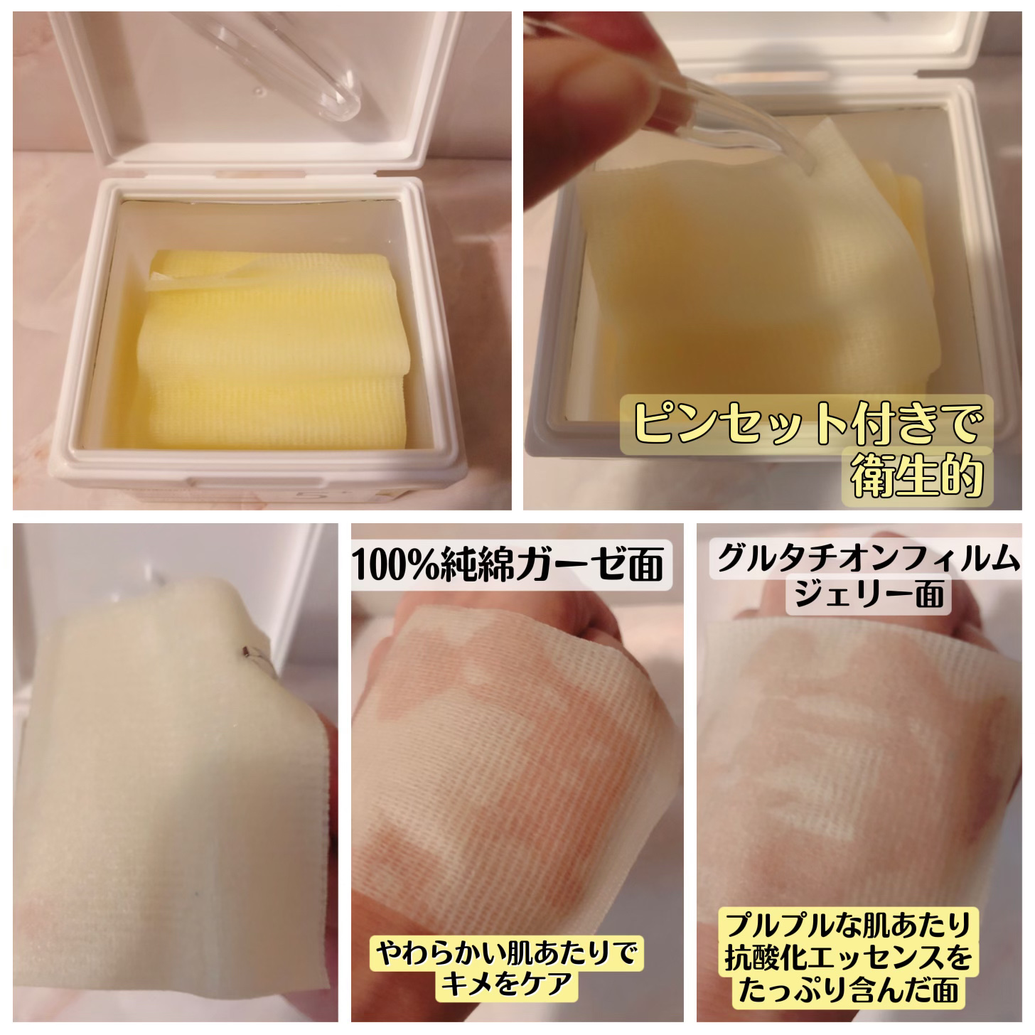 貼るグルタチオン♡ 100%純綿ガーゼ面、グルタチオンフィルムジェリー面の二面構成の四角いパッド◻️ 液ひたひた◎◎◎ ガーゼ面はキュッと引っかかるようなしっかりめのでこぼこ感。ジェリー面はつるっつる。 でもしっかりピタッと密着してくれる◎ ピンセットの収納場所があるのも嬉しい!