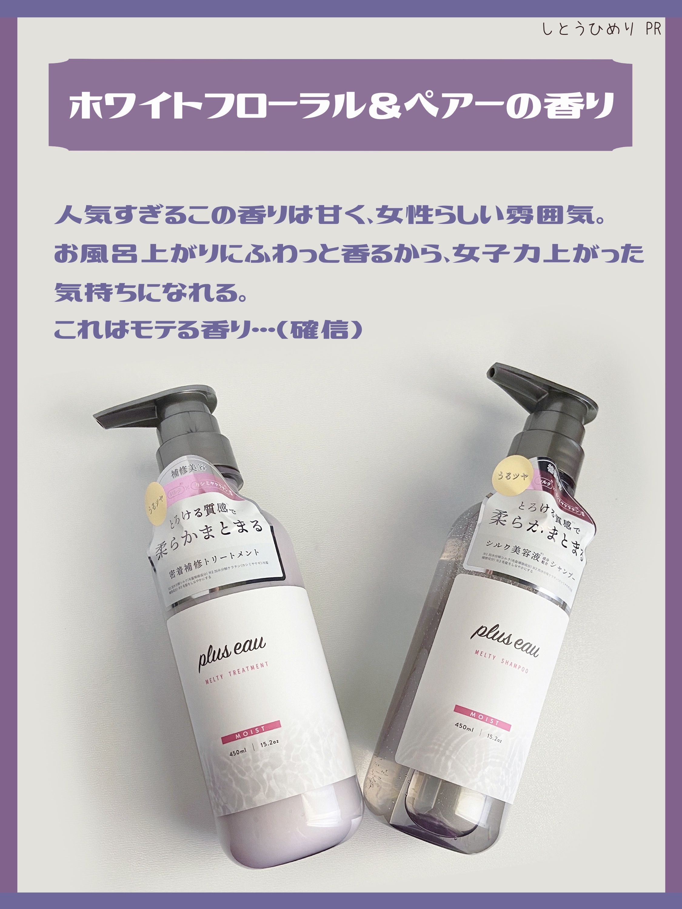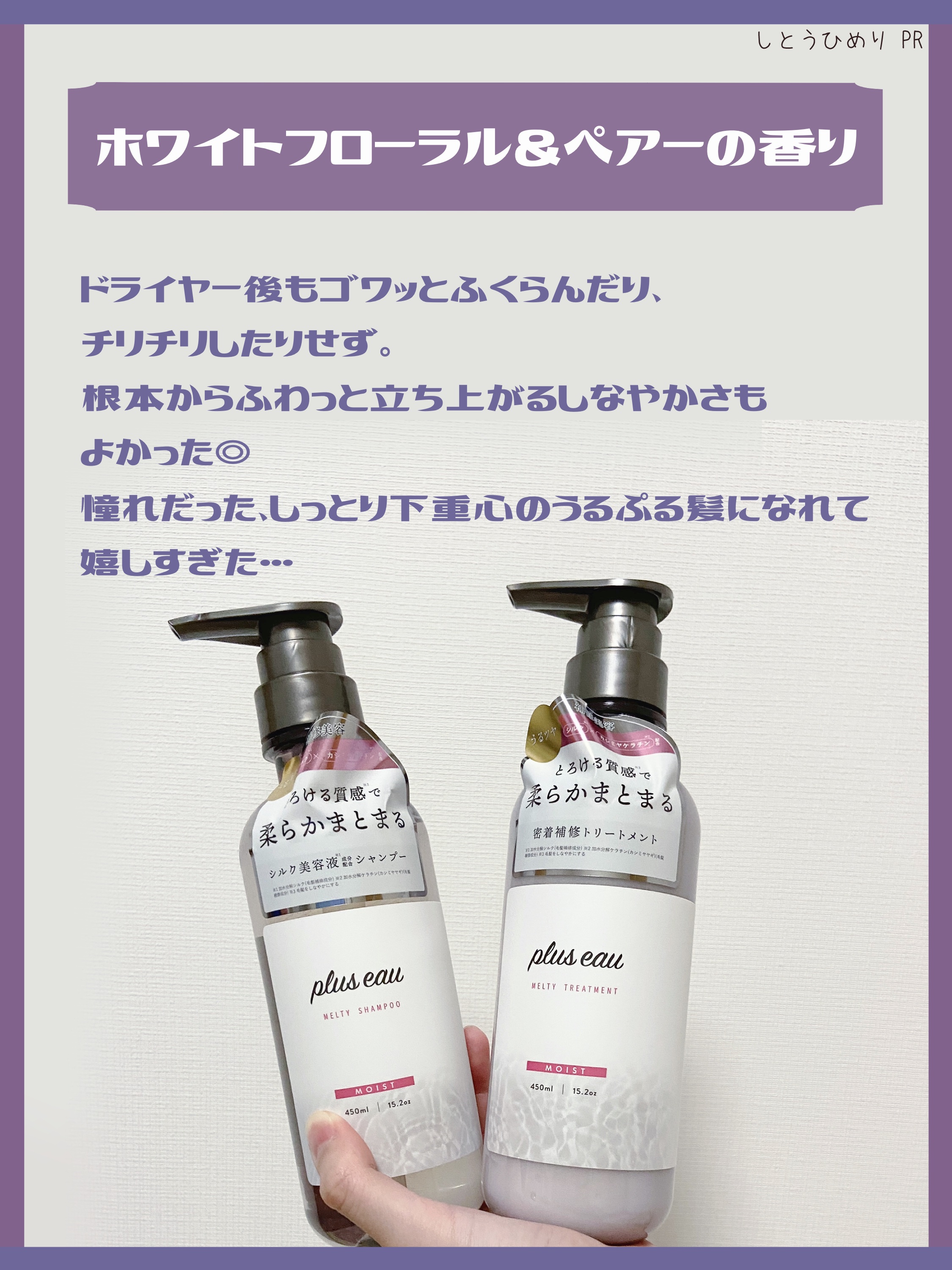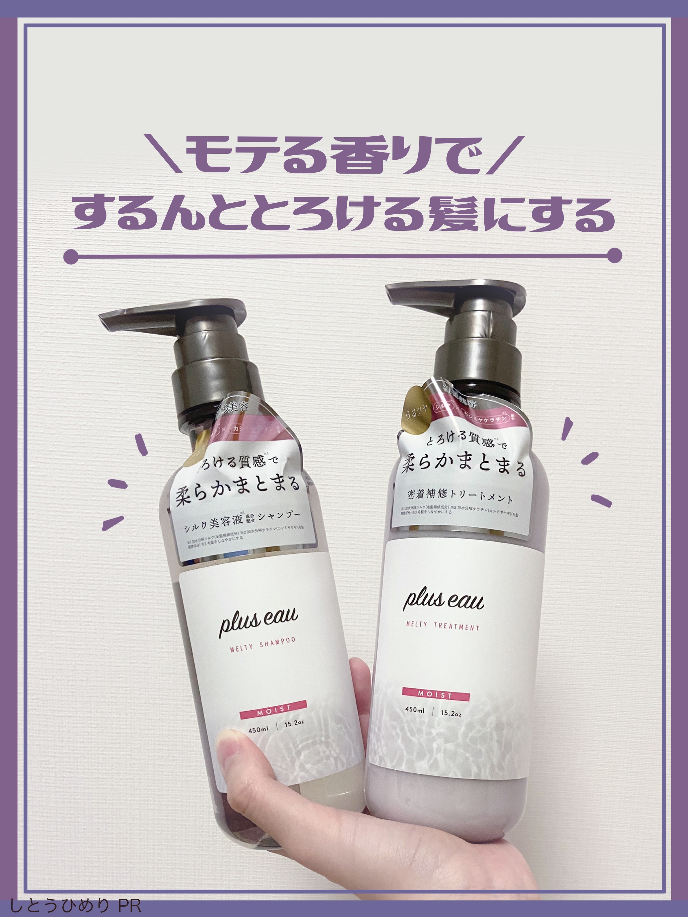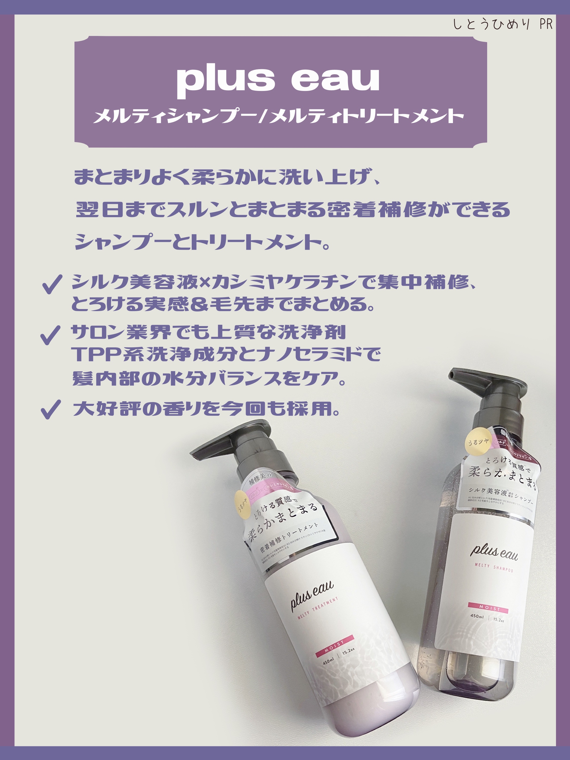 pluseau(プリュスオー)メルティシャンプー/メルティトリートメント使っています。プリュスオーの製品は相性良き。このメルティシャンプーも豊かな泡立ち、トリートメントも広がりやすい湿度の高い日もさほど広がらず、まとまりやすい髪の毛にしてくれ...