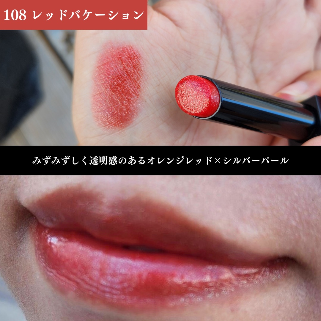 104 #桜色のひと時はグリーンラメが入っているまろやかピンクです。明るすぎず暗すぎず #ナチュラルメイク にもってこい✨これは大人気間違いなしの番人ウケピンクなのでは? 105 #日没後の情熱は透け感のある鮮やか明るめレッドです。うわーかわいい、めちゃくちゃかわいいです、これ。これからの暑い夏の季節にぴったりなカラー! 106 #夜雲の涙は青ラメ入りの透け感強めパープルピンクです。いやこれどブルベ全員好きなやつ〜!!!!!!カワイイなんか青ラメが雨粒みたいだしパープルが紫陽花みたいだし、いいですねえ。。。