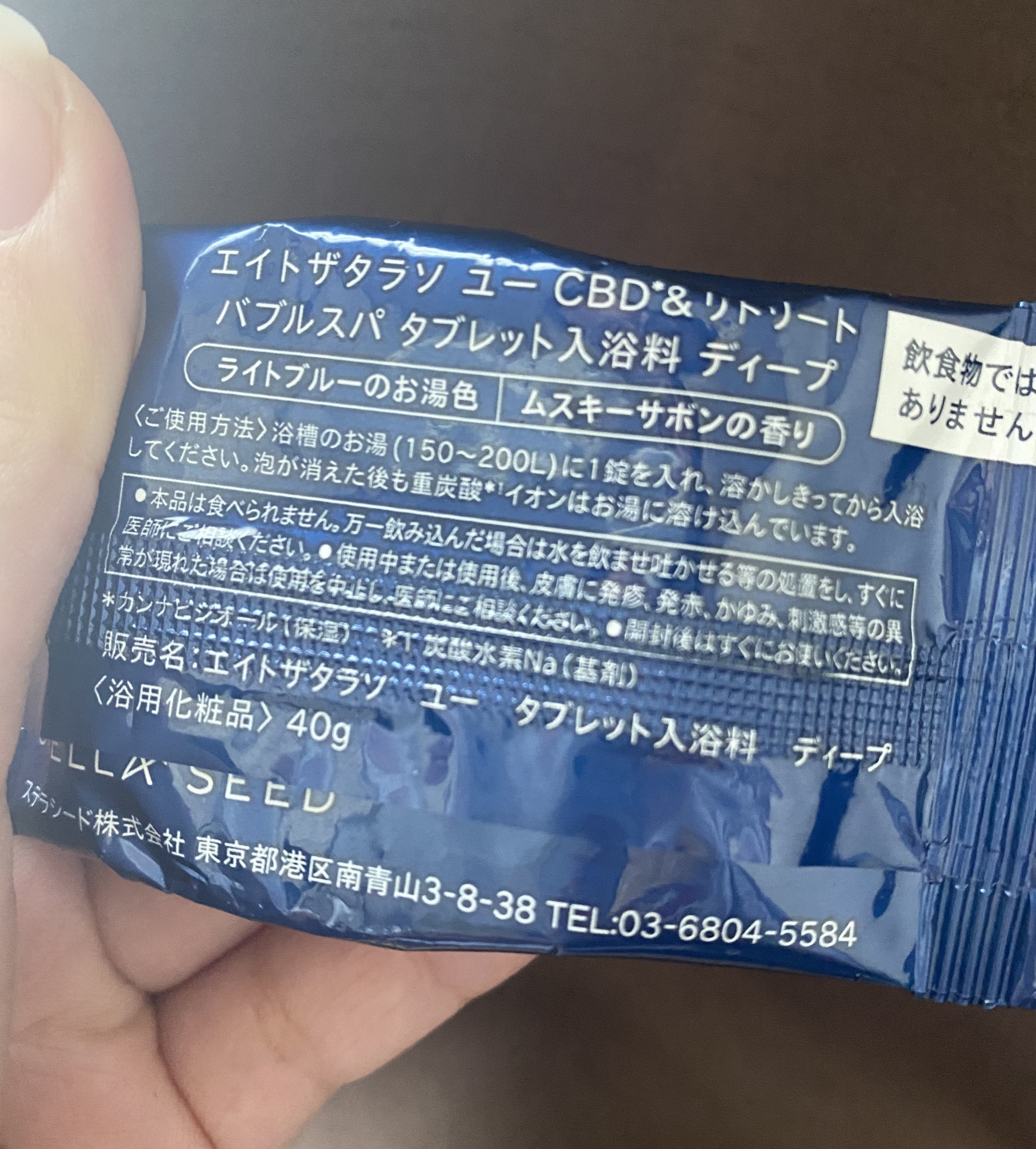 - スキンケア発想!自宅で炭酸スパが楽しめる、「CBD*1×重炭酸*2×エプソムソルト*3」配合のタブレット入浴料。海の恵みを凝縮した重炭酸*2スパで芯までじんわり温かく。さらに、柔らかくなめらかなお湯がカラダをやさしく包み込み、肌の潤いを保ちながら健やかに整えます。「ディープ」タイプは、CBD*1を高濃度*4配合!より深い安らぎの温浴タイムをお楽しみいただけます。ライトブルーのお湯色。ムスキーサボンの香り。 *1 カンナビジオール *2 炭酸水素Na(基剤) *3 硫酸Mg(保湿) *4 エイトザタラソ ユー タブレット入浴料 ライトと比較して