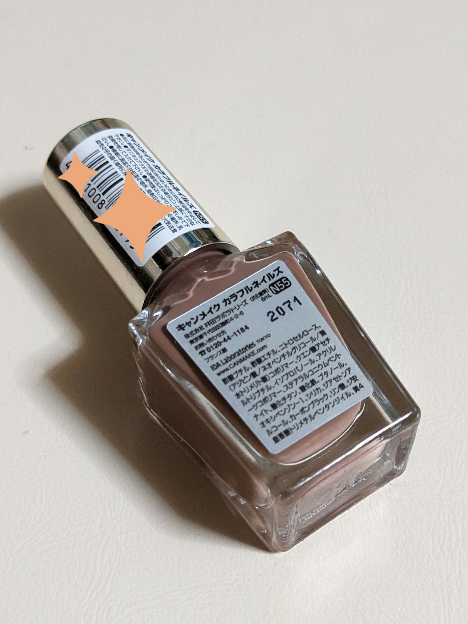 - <N02 シックボルドー> 酢酸ブチル、酢酸エチル、ニトロセルロース、(アジピン酸/ネオペンチルグリコール/無水トリメリト酸)コポリマー、クエン酸アセチルトリブチル、イソプロパノール、アクリレーツコポリマー、ステアラルコニウムベントナイト、酸化鉄、ブタノール、オキシベンゾン-1、シリカ、赤220、ジアセトンアルコール、酸化チタン、リン酸、カーボンブラック、ジ安息香酸トリメチルペンタンジイル、黄4、赤226 [旧]酢酸ブチル、酢酸エチル、ニトロセルロース、(アジピン酸/ネオペンチルグリコール/無水トリメリト酸)コポリマー、クエン酸アセチルトリブチル、イソプロパノール、アクリレーツコポリマー、ステアラルコニウムベントナイト、(スチレン/アクリレーツ)コポリマー、酸化鉄、ブタノール、シリカ、オキシベンゾン-1、赤220、ジアセトンアルコール、酸化チタン、ジ安息香酸トリメチルペンタンジイル、リン酸、カーボンブラック、黄4 <N08 ミスティモーヴ> 酢酸ブチル、酢酸エチル、ニトロセルロース、(アジピン酸/ネオペンチルグリコール/無水トリメリト酸)コポリマー、クエン酸アセチルトリブチル、イソプロパノール、アクリレーツコポリマー、ステアラルコニウムベントナイト、酸化チタン、ブタノール、シリカ、オキシベンゾン-1、マンガンバイオレット、ジアセトンアルコール、酸化鉄、赤226、リン酸、カオリン、ジ安息香酸トリメチルペンタンジイル、黄4 [旧] 酢酸ブチル、酢酸エチル、ニトロセルロース、(アジピン酸/ネオペンチルグリコール/無水トリメリト酸)コポリマー、クエン酸アセチルトリブチル、イソプロパノール、アクリレーツコポリマー、ステアラルコニウムベントナイト、(スチレン/アクリレーツ)コポリマー、酸化チタン、ブタノール、オキシベンゾン-1、シリカ、酸化鉄、ジアセトンアルコール、マンガンバイオレット、ジ安息香酸トリメチルペンタンジイル、リン酸、カーボンブラック、黄4 <N10 ペールラベンダー> 酢酸ブチル、酢酸エチル、ニトロセルロース、(アジピン酸/ネオペンチルグリコール/無水トリメリト酸)コポリマー、クエン酸アセチルトリブチル、イソプロパノール、アクリレーツコポリマー、ステアラルコニウムベントナイト、酸化チタン、ブタノール、酸化鉄、オキシベンゾン-1、シリカ、ジアセトンアルコール、マンガンバイオレット、リン酸、ジ安息香酸トリメチルペンタンジイル、黄4、赤226 [旧]酢酸ブチル、酢酸エチル、ニトロセルロース、(アジピン酸/ネオペンチルグリコール/無水トリメリト酸)コポリマー、クエン酸アセチルトリブチル、イソプロパノール、アクリレーツコポリマー、ステアラルコニウムベントナイト、酸化チタン、ブタノール、シリカ、オキシベンゾン-1、ジアセトンアルコール、酸化鉄、ジ安息香酸トリメチルペンタンジイル、マンガンバイオレット、リン酸、黄4 <N12 アーモンドグリーン> 酢酸ブチル、酢酸エチル、ニトロセルロース、(アジピン酸/ネオペンチルグリコール/無水トリメリト酸)コポリマー、クエン酸アセチルトリブチル、イソプロパノール、アクリレーツコポリマー、ステアラルコニウムベントナイト、(スチレン/アクリレーツ)コポリマー、酸化チタン、ブタノール、シリカ、オキシベンゾン-1、ジアセトンアルコール、ジ安息香酸トリメチルペンタンジイル、黄4、カーボンブラック、リン酸、コンジョウ <N16 ココア> 酢酸ブチル、酢酸エチル、ニトロセルロース、(アジピン酸/ネオペンチルグリコール/無水トリメリト酸)コポリマー、クエン酸アセチルトリブチル、イソプロパノール、酸化チタン、アクリレーツコポリマー、ステアラルコニウムベントナイト、酸化鉄、ブタノール、シリカ、オキシベンゾン-1、ジアセトンアルコール、黄4、リン酸、ジ安息香酸トリメチルペンタンジイル、カーボンブラック、赤226 [旧]酢酸ブチル、酢酸エチル、ニトロセルロース、(アジピン酸/ネオペンチルグリコール/無水トリメリト酸)コポリマー、クエン酸アセチルトリブチル、イソプロパノール、酸化チタン、アクリレーツコポリマー、ステアラルコニウムベントナイト、ブタノール、酸化鉄、シリカ、オキシベンゾン-1、ジアセトンアルコール、ジ安息香酸トリメチルペンタンジイル、黄4、リン酸、カーボンブラック <N17 クリームチャイ> 酢酸ブチル、酢酸エチル、ニトロセルロース、(アジピン酸/ネオペンチルグリコール/無水トリメリト酸)コポリマー、クエン酸アセチルトリブチル、イソプロパノール、アクリレーツコポリマー、ステアラルコニウムベントナイト、(スチレン/アクリレーツ)コポリマー、酸化チタン、ブタノール、シリカ、オキシベンゾン-1、ジアセトンアルコール、ジ安息香酸トリメチルペンタンジイル、酸化鉄、リン酸、黄4、カーボンブラック <N19 スウィートコーラル> 酢酸ブチル、酢酸エチル、ニトロセルロース、(アジピン酸/ネオペンチルグリコール/無水トリメリト酸)コポリマー、クエン酸アセチ