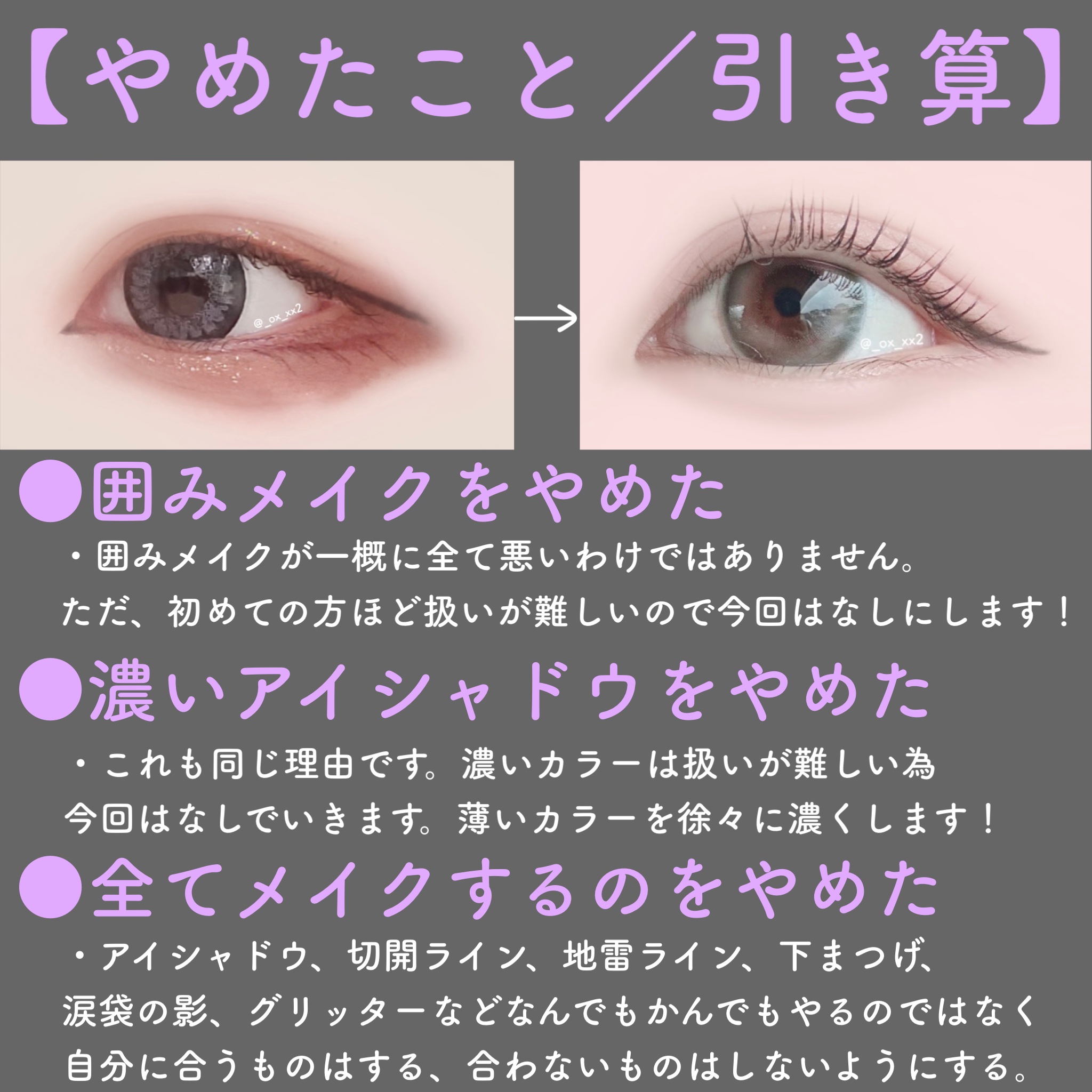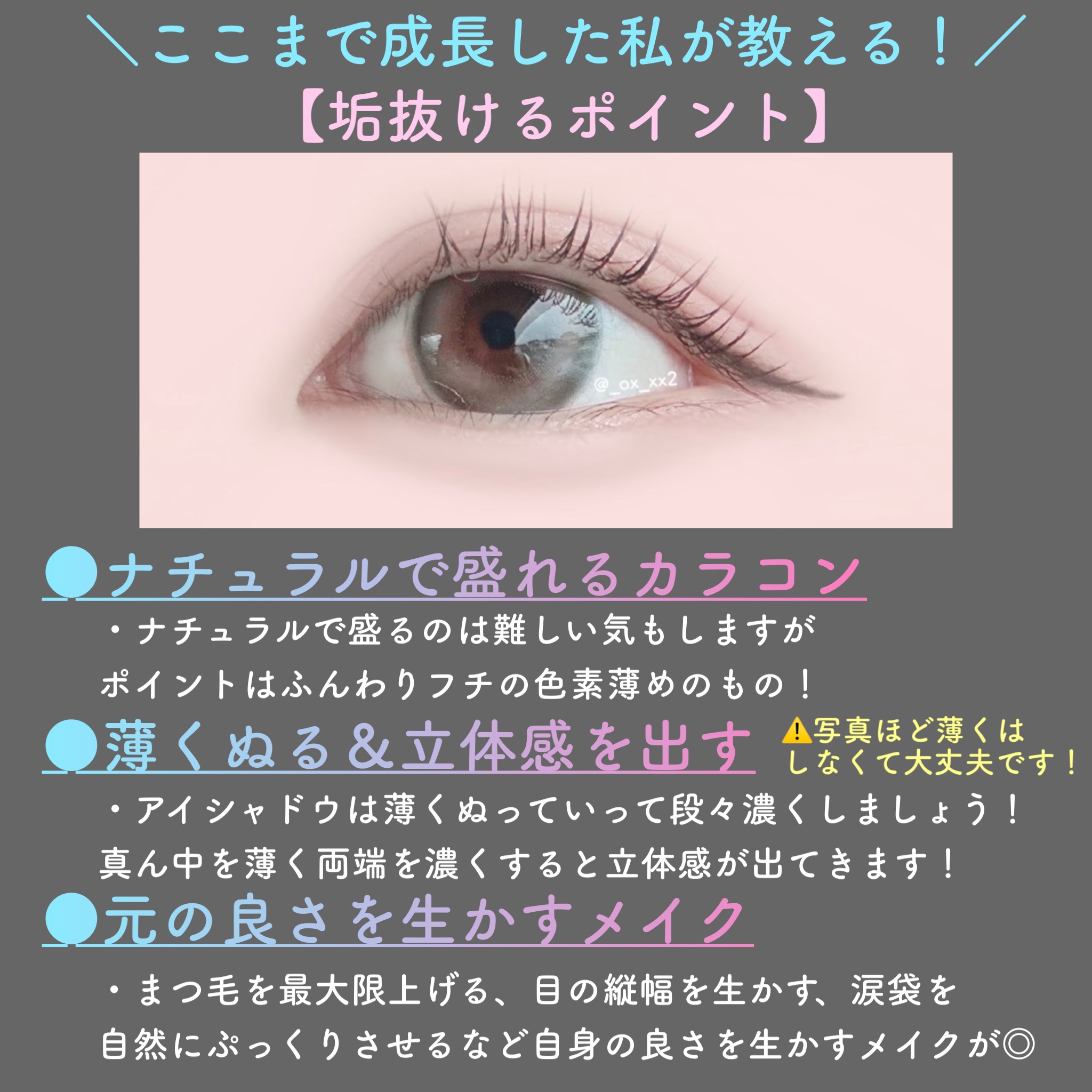 💗ベースカラーを全体にのせる💗 薄めのカラーがオススメです! 🍊二重幅にグラデーションになるようにのせる🍊 目の縦幅を出すためにグラデにします! 🍇アイライナーを長めに引く🍇 上目頭と上目尻に引く、目の横幅を出すためです!