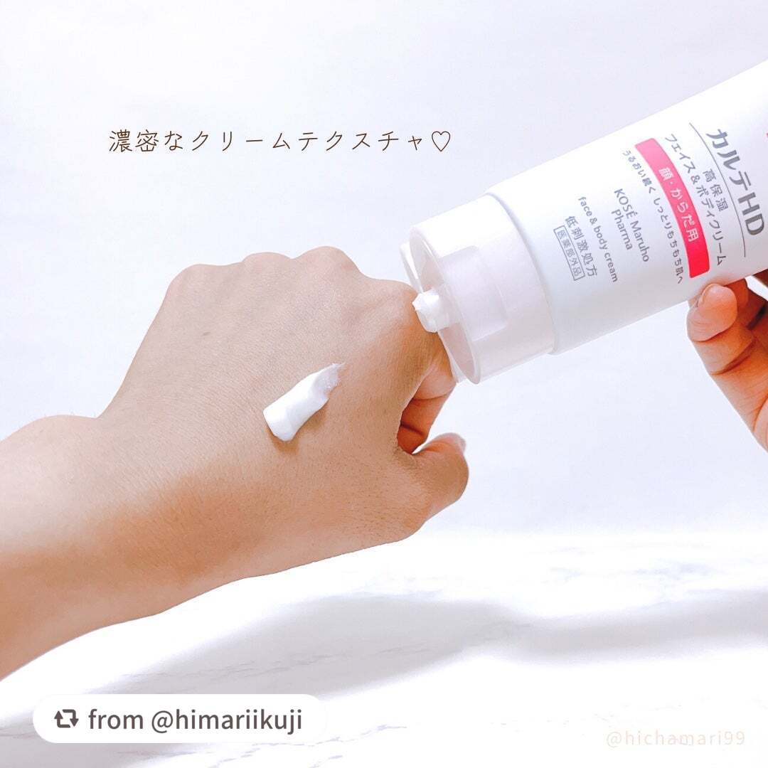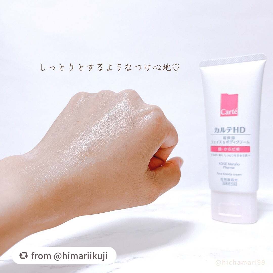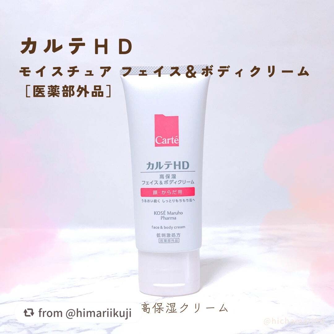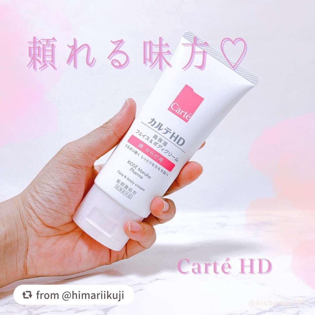 - 【全身用高保湿クリーム】 コーセーとマルホの合弁会社コーセーマルホファーマから発売された「カルテHD」。マルホから唯一供給を受けた「ヘパリン類似物質HD」を配合。 ゴワついたあれがちな肌にもピタッと密着、もっちりなめらか肌に導く全身用高保湿クリーム。 ひじ・ひざ・かかとなど気になるパーツにもピタッと密着してシールドできる「ワセリン」や「ピタッと保護膜オイル」を高配合。 それでいてのびの良いオイルとバランスよく組み合わせているから、腕やすねなどの広い範囲にもスーッと軽やかにのばせます。 フェイス&ボディローションと共通の「肌やわらかオイル」も配合。 濃厚なうるおいで肌をしっかり包み込みながらべたつかない使い心地です。