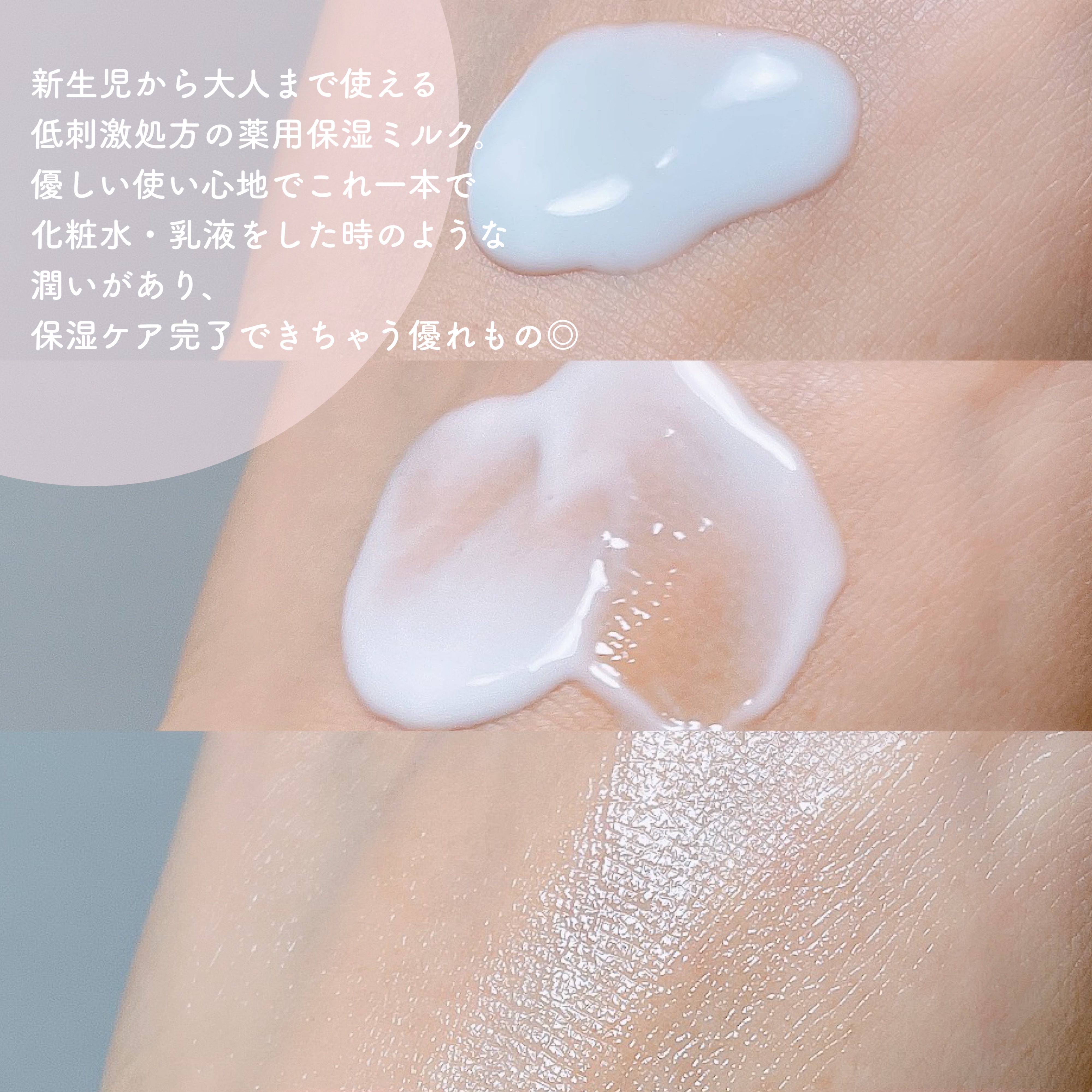 - 【医薬部外品】 新生児から敏感肌の大人まで使える低刺激処方。コクのあるまろやかでなめらかなミルクで、乾燥や肌あれを防ぐ薬用ミルク。 ●肌あれ防止有効成分配合。乾燥が気になる肌をやさしい使い心地でケアして、澄んだ透明感のある健やかな肌を保つ薬用保湿ミルクです。 ●新生児の肌から大人の敏感肌まで、デリケートな肌にもご使用いただける低刺激処方です。 ●やわらかい肌あたりで、使い心地もしっとりやさしく、これ 1品で毎日の保湿ケアが完了します。 ●顔にもボディにもご使用いただけます。 ●アルコール(エチルアルコール)フリー/パラベン(防腐剤)フリー/鉱物油フリー/グルテンフリー/紫外線吸収剤フリー/無香料・無着色 ●アレルギーテスト済み/敏感肌のかたの協力による連用テスト済み/スティンギング(皮膚刺激感)テスト済み すべてのかたにアレルギーや刺激等が起きない、刺激感がないというわけではありません。 ●有効成分グリチルリチン酸ジカリウム(肌あれ防止) ●シソオイル〔エゴマオイル〕(エモリエント) ●ワレモコウエキス / グリセリン(保湿)