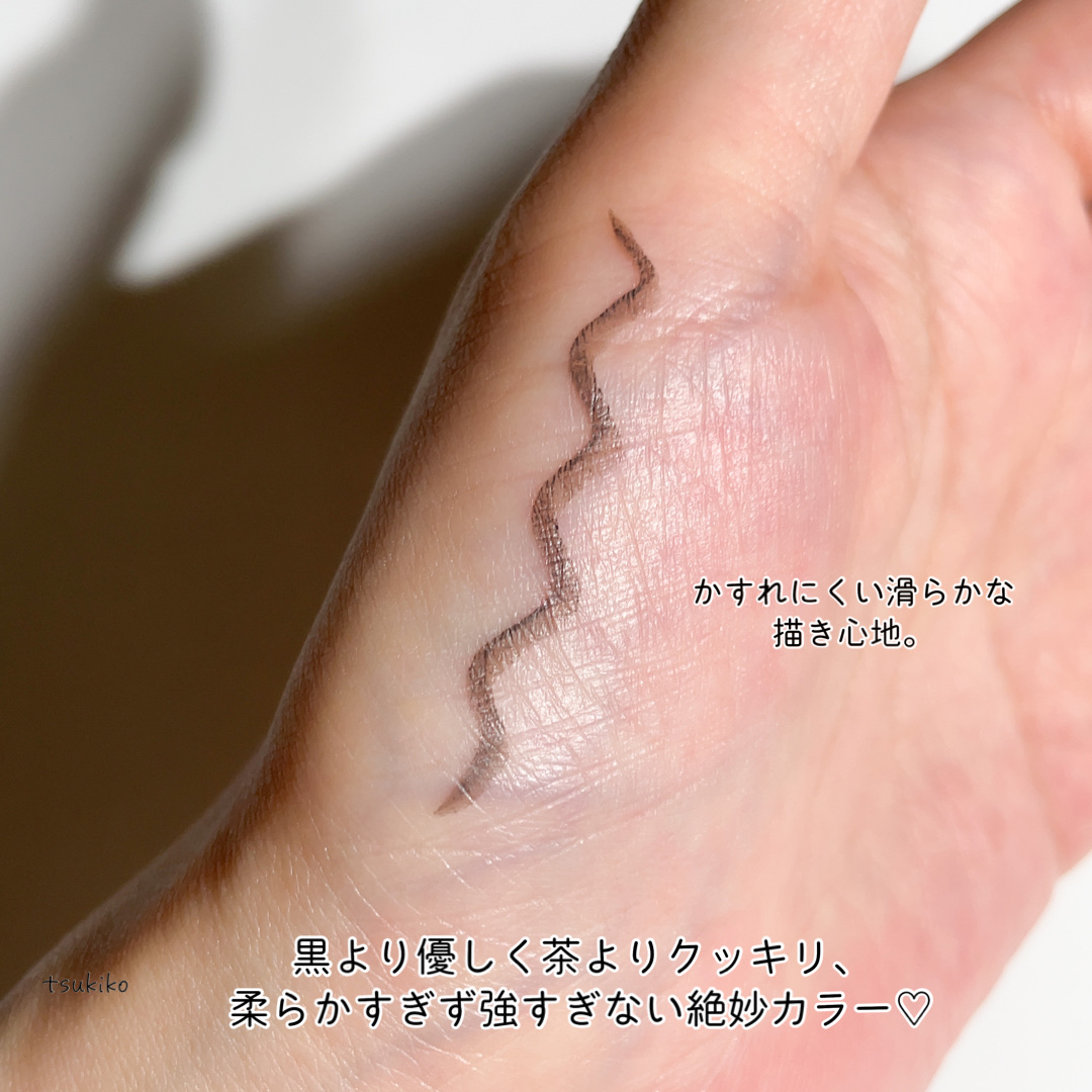 - 筆先までずっとなめらか、目尻で感動するリキッドアイライナー。 必要な量が肌にのる新設計で、まぶたの上をすべるような、滑らかな描き心地。しなやかでコシのある筆が、筆圧のコントロールを容易にし、太いラインも細いラインも思い通りに仕上げます。水、汗、涙に強いウォータープルーフタイプなのに、通常洗顔で簡単オフ。肌に色素が残らない顔料を使用。5種類の美容液成分を従来品の200%配合し、メイクしながら目元ケアまで。 ●ブラウンブラック ※2020年9月12日 バラエティショップ先行発売 ●漆黒ブラック ※2020年12月頃発売予定 ●ナチュラルブラウン ※2020年12月頃発売予定 ●シフォンブラウン 「毎日メイクに透明感と抜け感」 ブラウンでも、グレーでも、ベージュでもないニュアンスカラー。 自然な印影で素の目元を際立て、頑張りすぎない、ふんわりとした目元に。 ●アプリコットブラウン 「じゅわっと血色感。 肌に馴染むおしゃれカラー」 温かみのあるアプリコットがじゅわっと滲む血色感を目元に演出。 肌馴染みが良いので、カラーライナーに抵抗がある方もブラウンの延長線上で楽しめる、使いやすい色味です。 ”ちょっとオシャレ”な空気感を演出するカラー。 ●ピンクショコラ アイライナー 「ピンクが溶け込む濃厚ブラウン」 肌馴染みが良く、目元にじんわり血色感をプラス。 さりげなく女性らしさが加速するようなカラー。 ●ピスタチオラテ (2022年7月29日(金)発売) 「“目尻”に抜け感アクセント」 肌に馴染むのに映える絶妙なグリーン。 トレンドカラーに“くすみ”と“抜け感”をプラスしたまろやかな発色。 ●マスタードブラウン 「“イエロー”が揺れる、大人の洒落色」 (2022年7月29日(金)発売) まるで太陽のような暖かさを感じる新しいブラウン。 ほんのり感じるイエローでメイクが一気に垢抜ける稀有な色。 ●シフォンピンク(2023年2月10日発売) 「ふんわり柔らか"まろみピンク"」 甘くなりすぎない青みニュアンスで目元の透明感UP。 目元を引き締め、ピンクメイクにありがちな腫れぼったさを解消。 ●ミルクカプチーノ(2023年4月21日発売) まろやかな深みの“優しい締め色” どんなメイクにも合わせやすいカラー。 自然な陰影でさりげなく目幅を拡張します。 ●グレーカシミア(2023年10月1日発売) ブラウンがほんのり溶け込んだ、暖色グレー まろやかな発色で、パーソナルカラーを問わず肌に馴染む 目元の陰影になりすまし、抜け感と目力を欲張りに叶える ●ダークフィグ(2024年6月1日発売) するする”なめらか。描きやすいのに、落ちにくい。 クッキリ可愛いほの甘ダークブラウン ●ピーチモカ(2024年8月1日発売) ふわっと自然に盛れる“桃色ブラウン” ほんのり血色感で目元にうるみ感を演出 ●スターダストブラウン(2024年12月11日発売) キラッと繊細に輝く''星屑ブラウン'' 透け感のあるダークブラウンの色味とラメの輝きが、目元に艶のある立体感を演出 ●チャコールモカ(2025年4月10日発売) 目元を締める''深みグレージュ'' 黄みや赤みに偏りすぎない絶妙な色設計で、自然に目元を強調