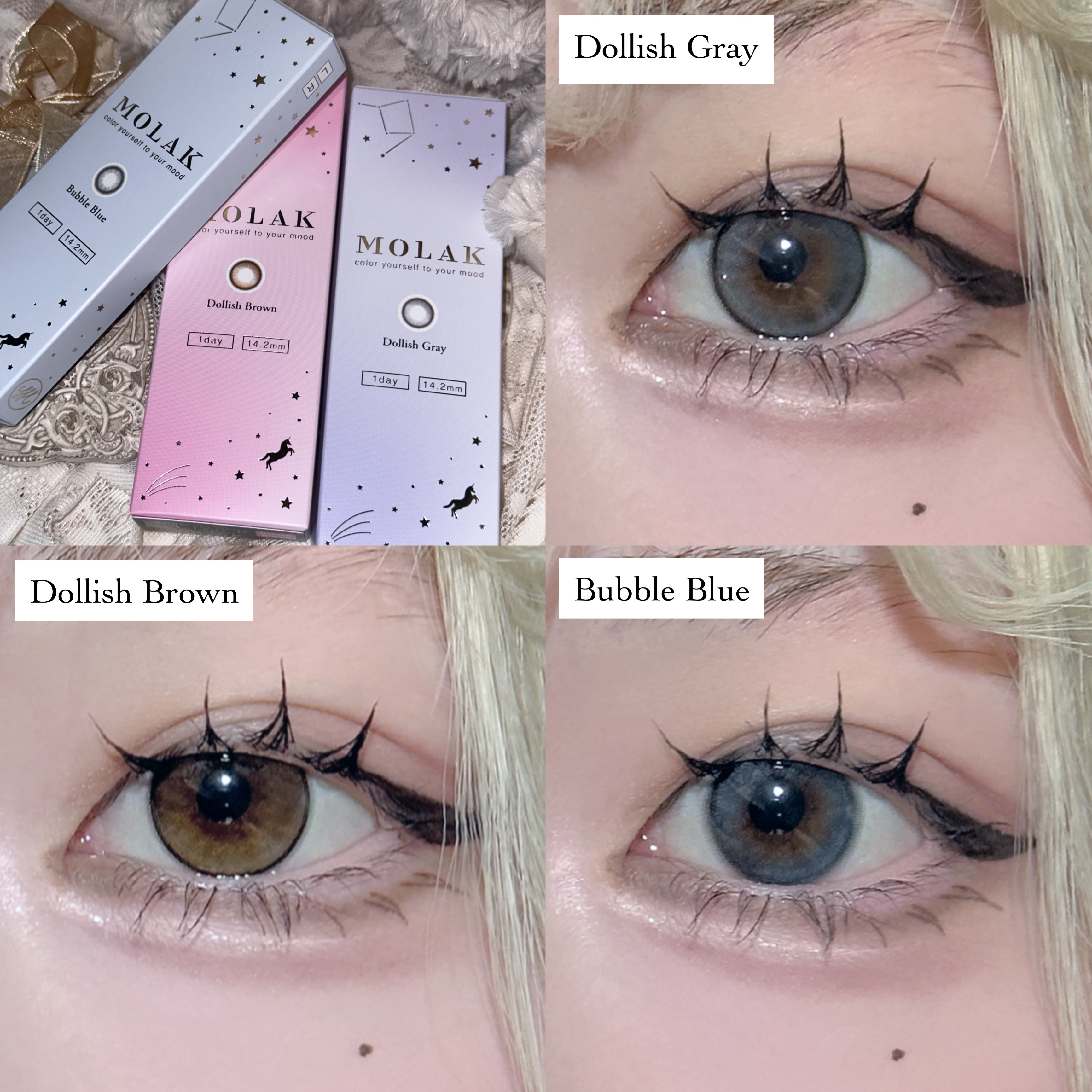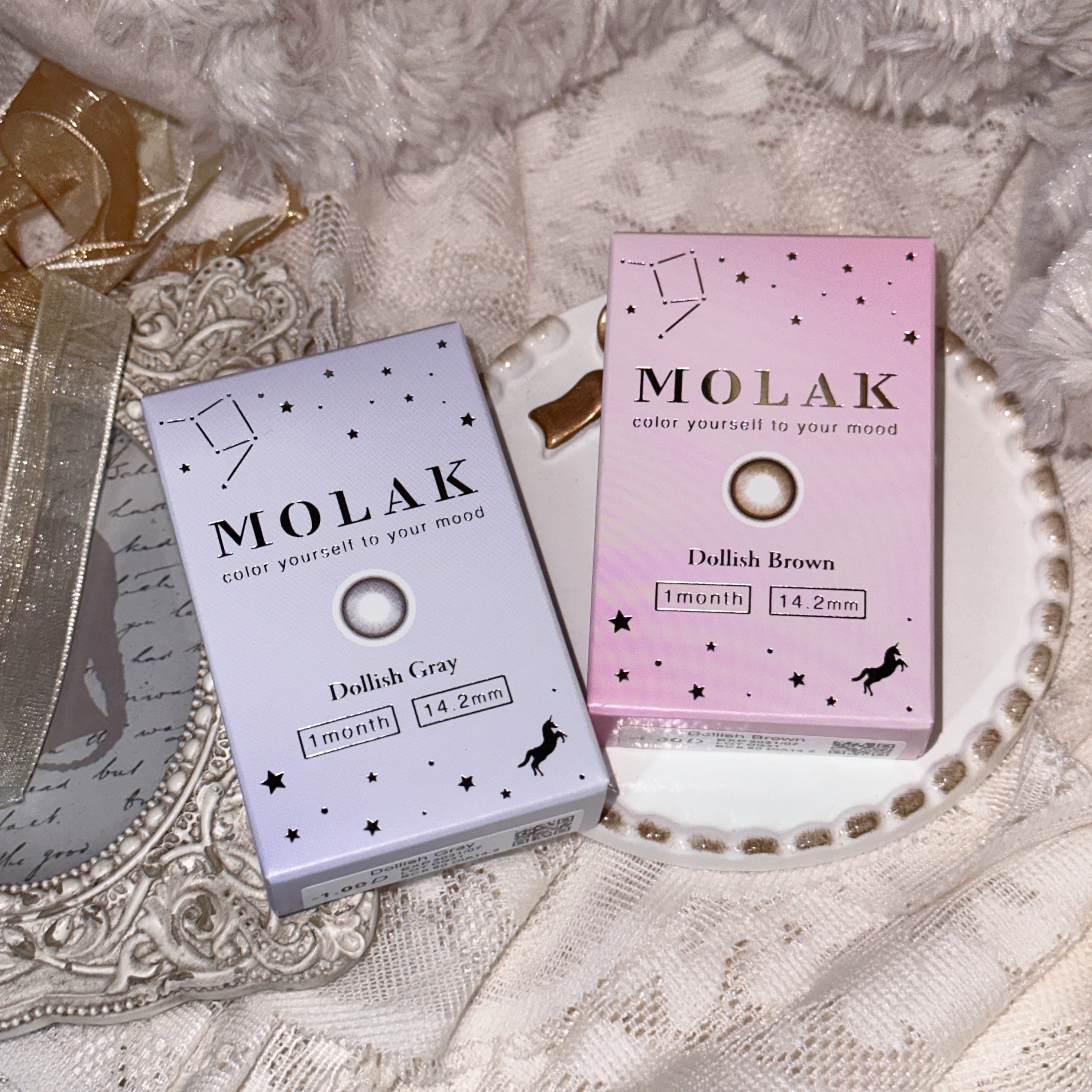 宮脇咲良さんプロデュースのカラコン、MOLAK‼ 日常的に使いやすいデザインから、特別な日のためのデザインまで種類が豊富。含水率55%の高含水でつけ心地滑らか‼ 目元アイドルですか?っていうくらい綺麗なグレーの水光レンズ。小粒目な私でも、目に光が入って目元の印象をハッキリさせてくれる! 目の印象が儚げになって、一気にアンニュイ顔に‼ 目の縁が少しぼやけて、柔らかめの印象なれちゃいます。透明感が爆誕するよ✨