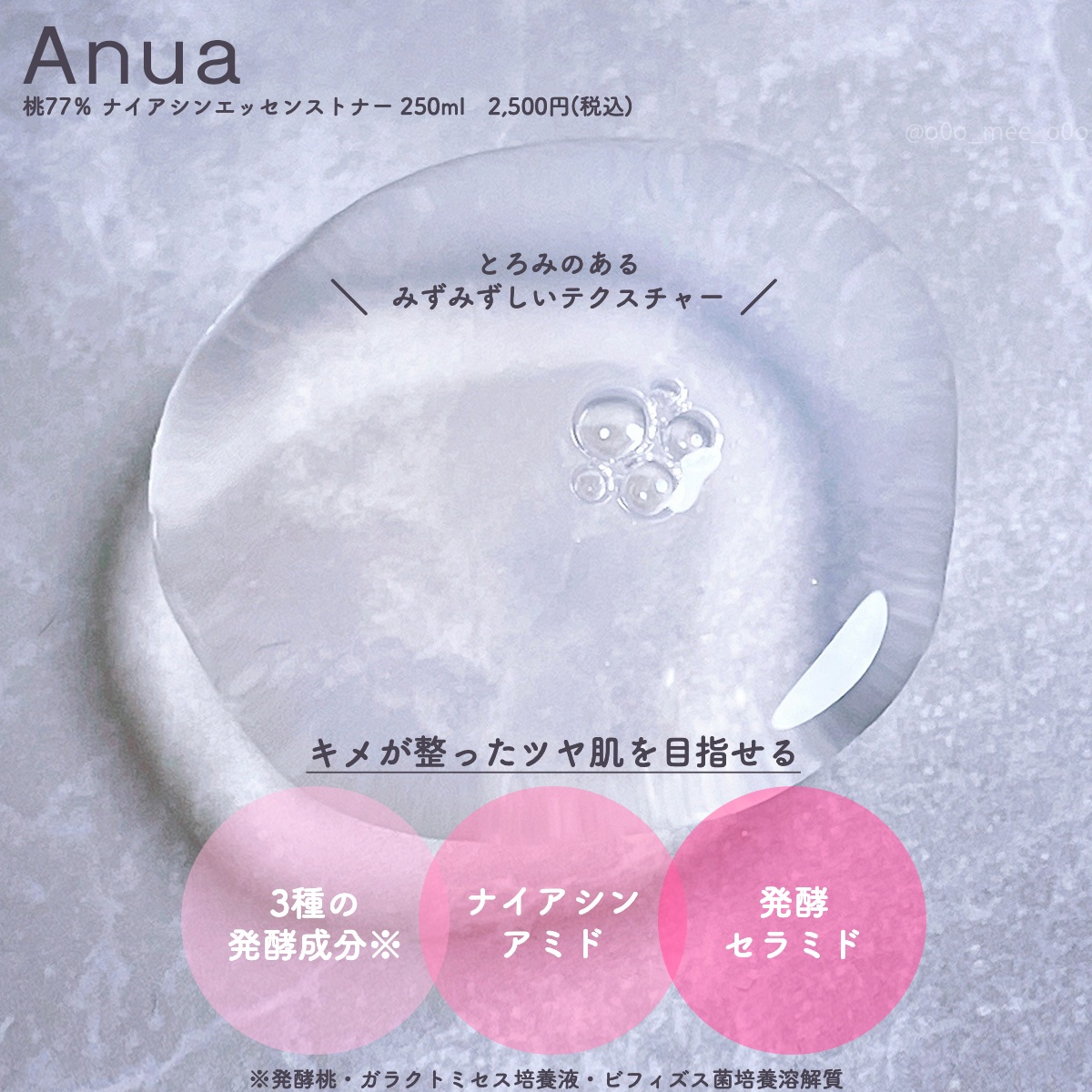 みずみずしい透明感、肌にチャージ🫧Anua桃77ナイアシンエッセンストナー\ピーチエキス×ナイアシンアミド配合!/ツルッとしたキメ肌に整え、メイクの土台を整えてくれるトナー✨💧少しとろみがあるのにベタつかずしっとり保湿💧重ね付けやコットンパッ...