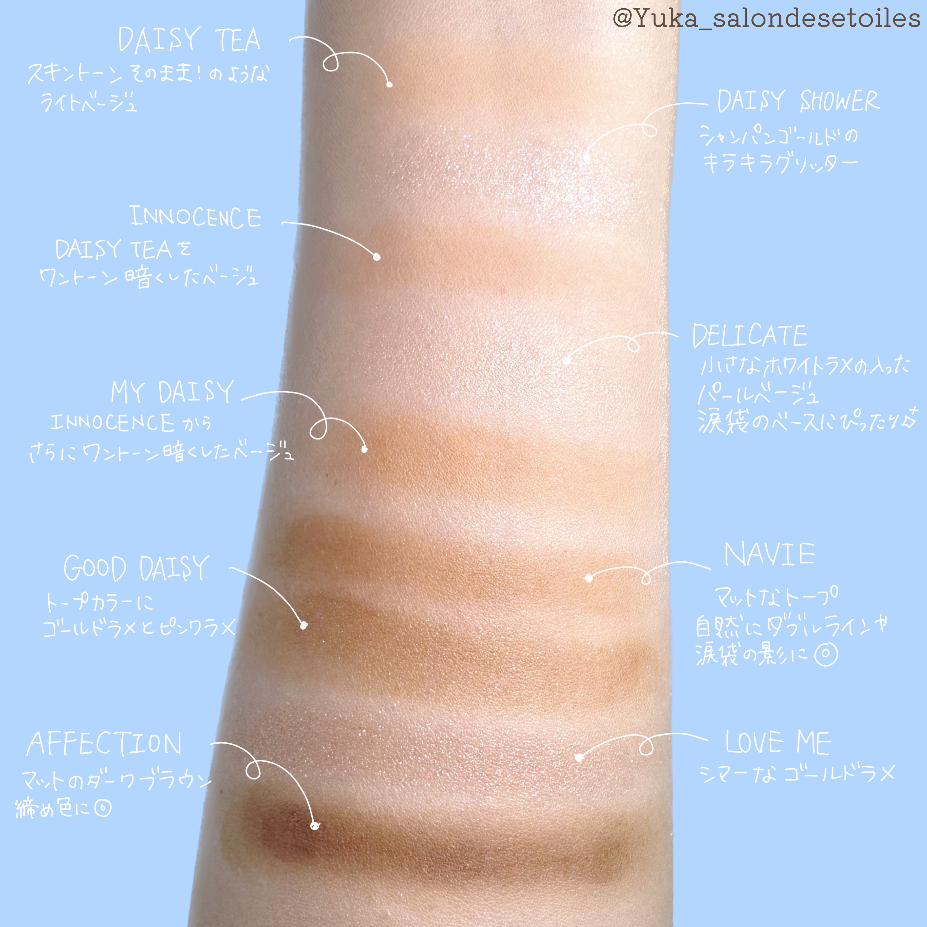 ピンク&グレー&シルバーを感じられるカラーが多い 派手すぎず上品さがあってくすみピンクがとっても大人かわいいカラーパレット しっとりとした粉質ラメ感も大粒すぎなくて肌馴染みがいい◎ ナチュラルな発色なので重ね付けすると良さげ。 高発色で上品なパール入りで輝き&しっとりな粉質で立体感のある仕上がりに!