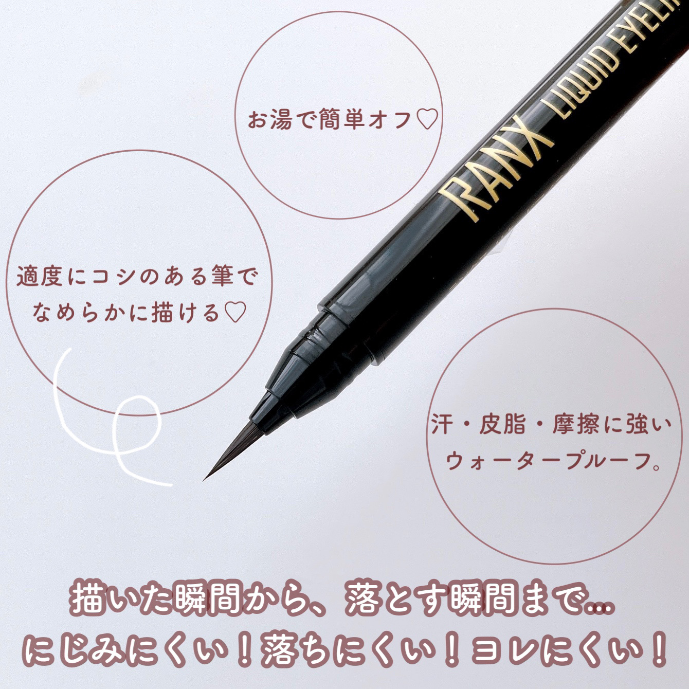 落ちにくいと噂の、RANX(ランクス)のアイライナーを使わせて頂いた。■RANXリキッドアイライナー (税込1,500円全3色)速乾性が高く、にじみにくいアイライナー。描いてすぐにまばたきしても色移りしない!汗・皮脂・摩擦に強いウォータープル...