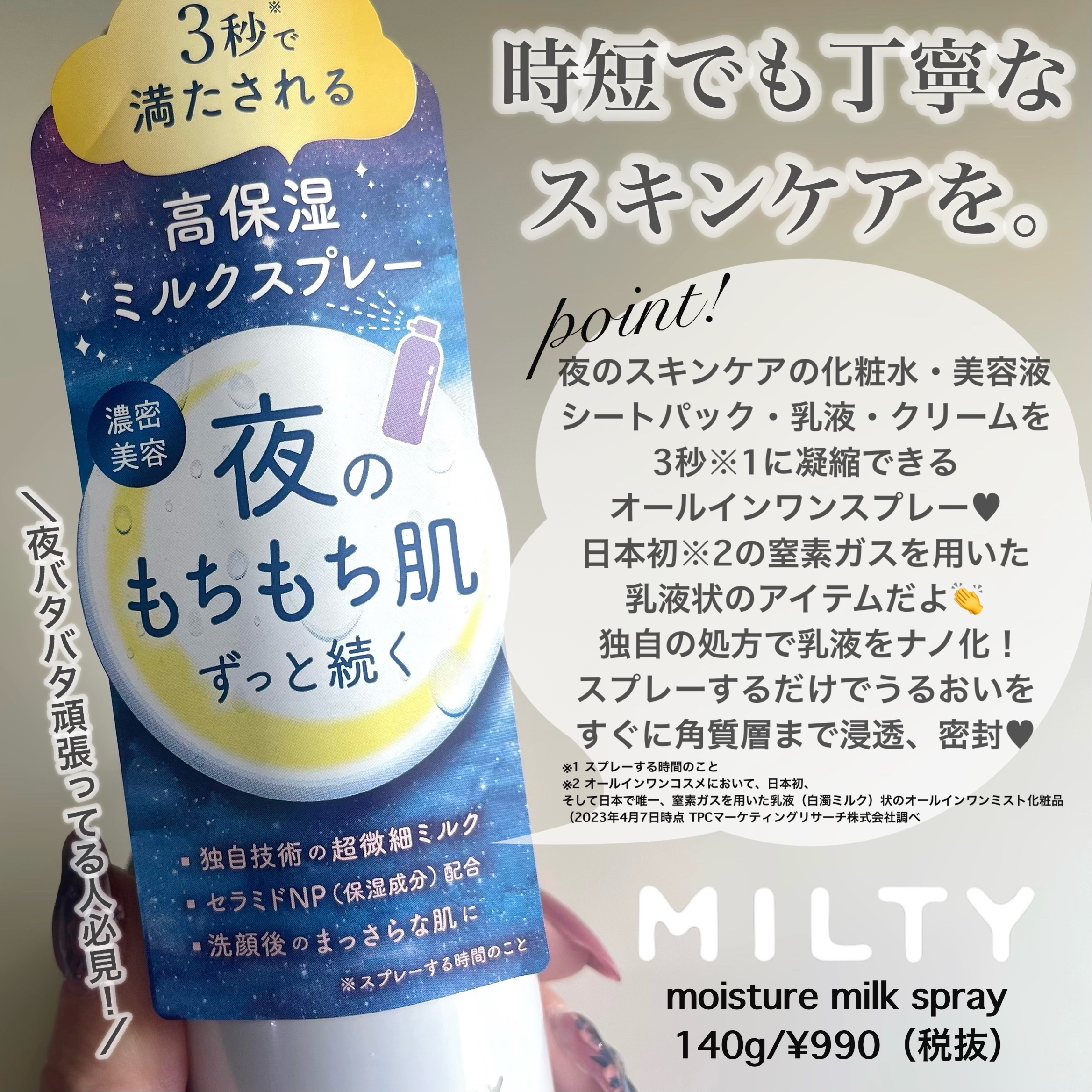 NARISUPナリスアップ🩵『ミルティーモイスチャーミルクスプレー』140g(スプレー状乳液)NARISUP様から🎁いただきました🐦ありがとうございます💓🪷振らずにスプレーするだけでしっとり感が続きます🪷洗顔後〜お風呂あがりや外出時などの乾燥...