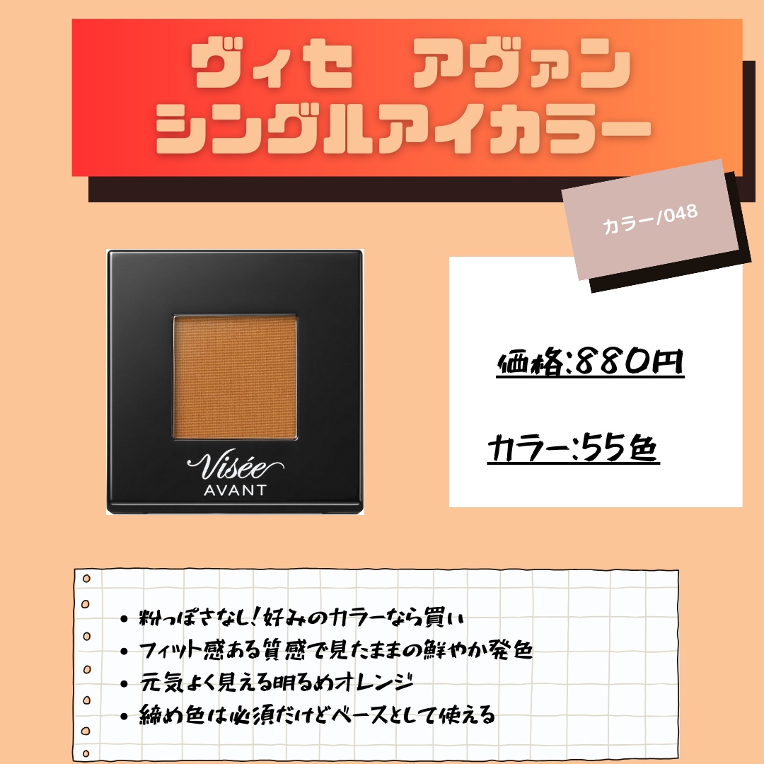 【甘辛HOTなジンジャー🔥ViseeAVANTのシングルアイシャドウ】豊富な色展開と上品なパケでプチプラとは思えないシングルアイシャドウ!HONEYGINGERはマットでエネルギッシュな熱気と甘さのあるオレンジカラー!ViseeAVANT(ヴ...