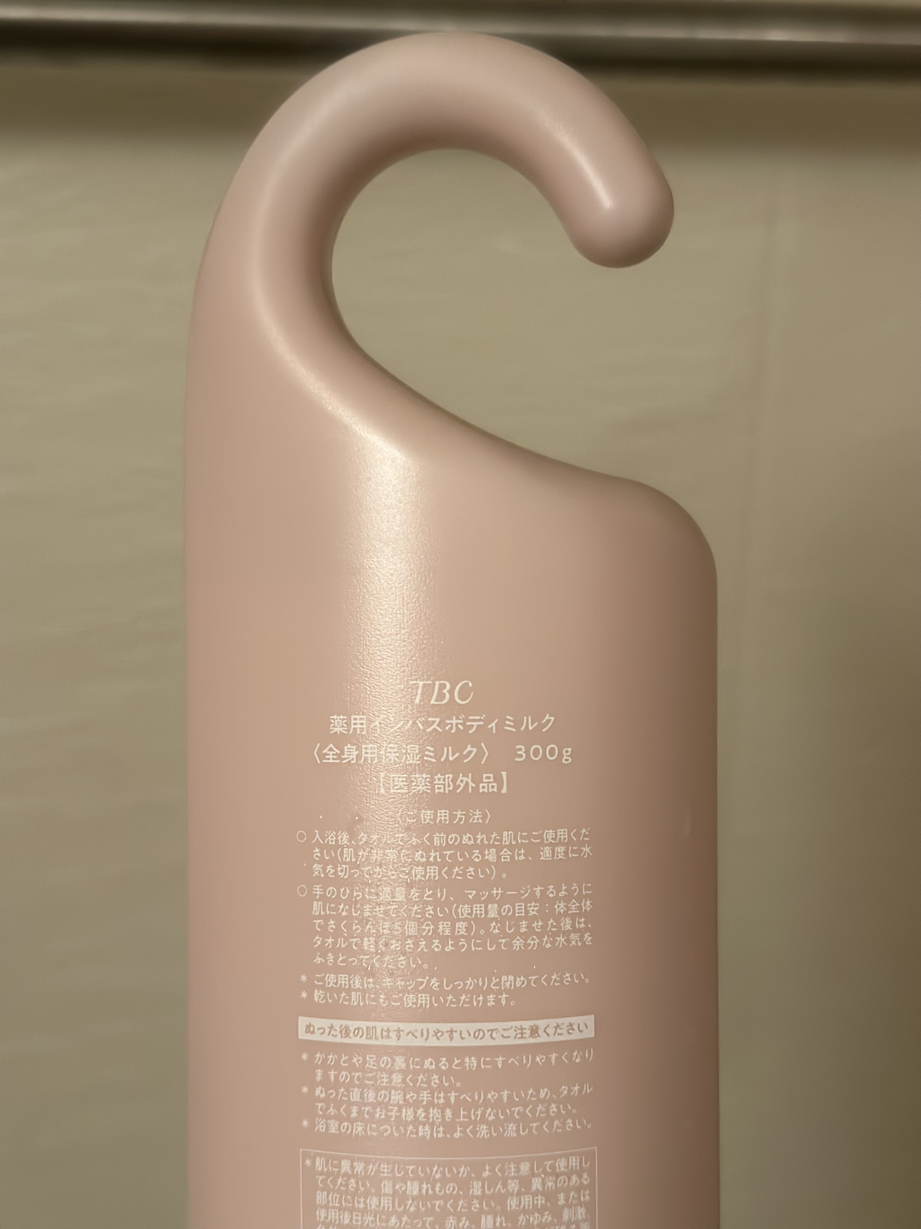 濡れた肌にもなじみが良くて、しっとり潤う様な使用感。 ほーんのり、良い香り💖 自宅のお風呂場で、タオル掛けに吊り下げて、使っています。 乾燥の気になる足や脚、腕もデコルテも、お尻や内股にもなじませています。