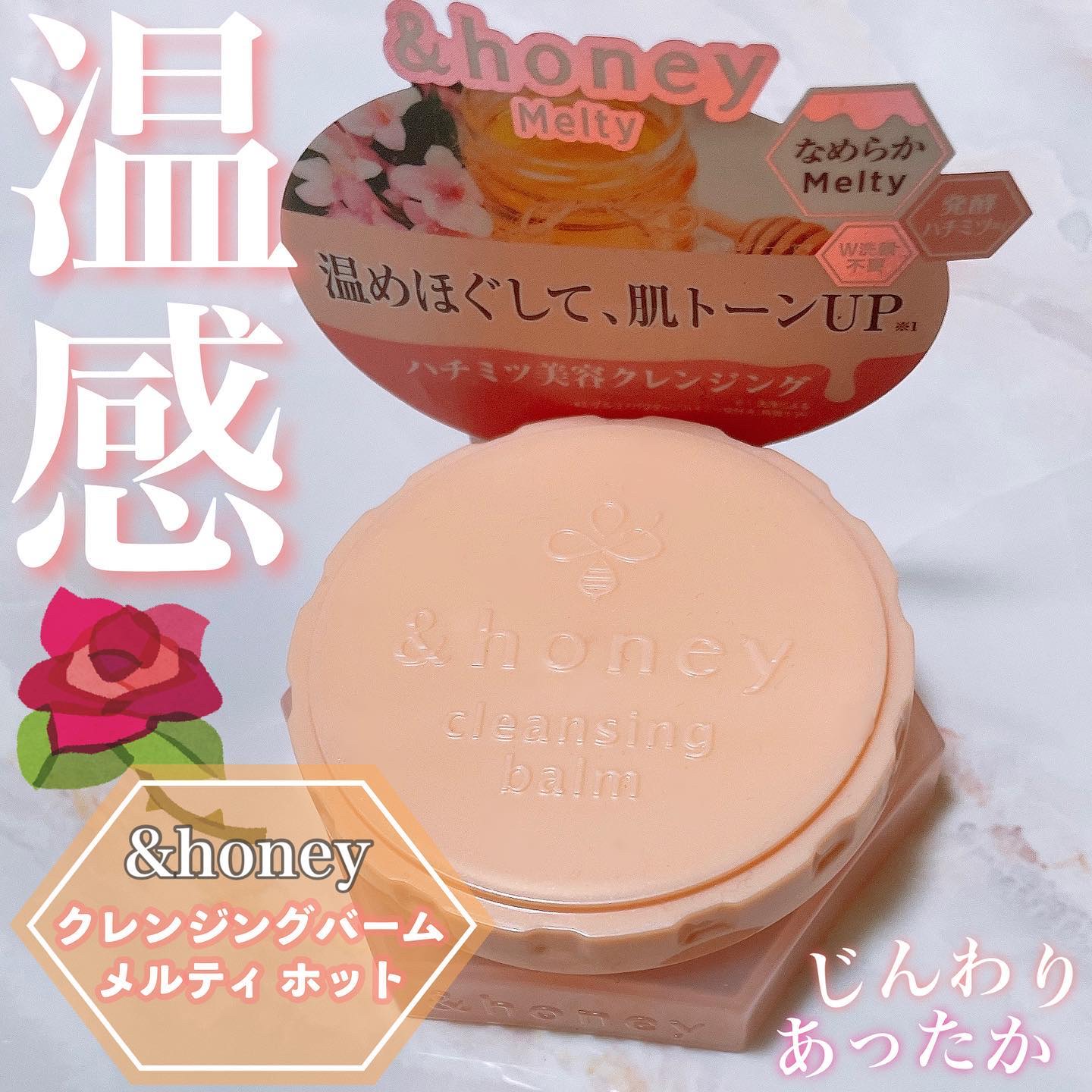 - &honey クレンジングバームから じんわりあったか温感バーム【メルティホット】シリーズ とろけるあったかバームがじんわりお肌をやわらげることで、 メイクや古い角質を浮かし、なめらかなお肌へ導きます。 製品の90%以上を保湿・整肌成分で構成しW酵素成分を配合することで、くすみ※をケアして肌トーンUP 香りは甘く華やかなシャワーローズハニーの香り。 ※古い角質や汚れによる