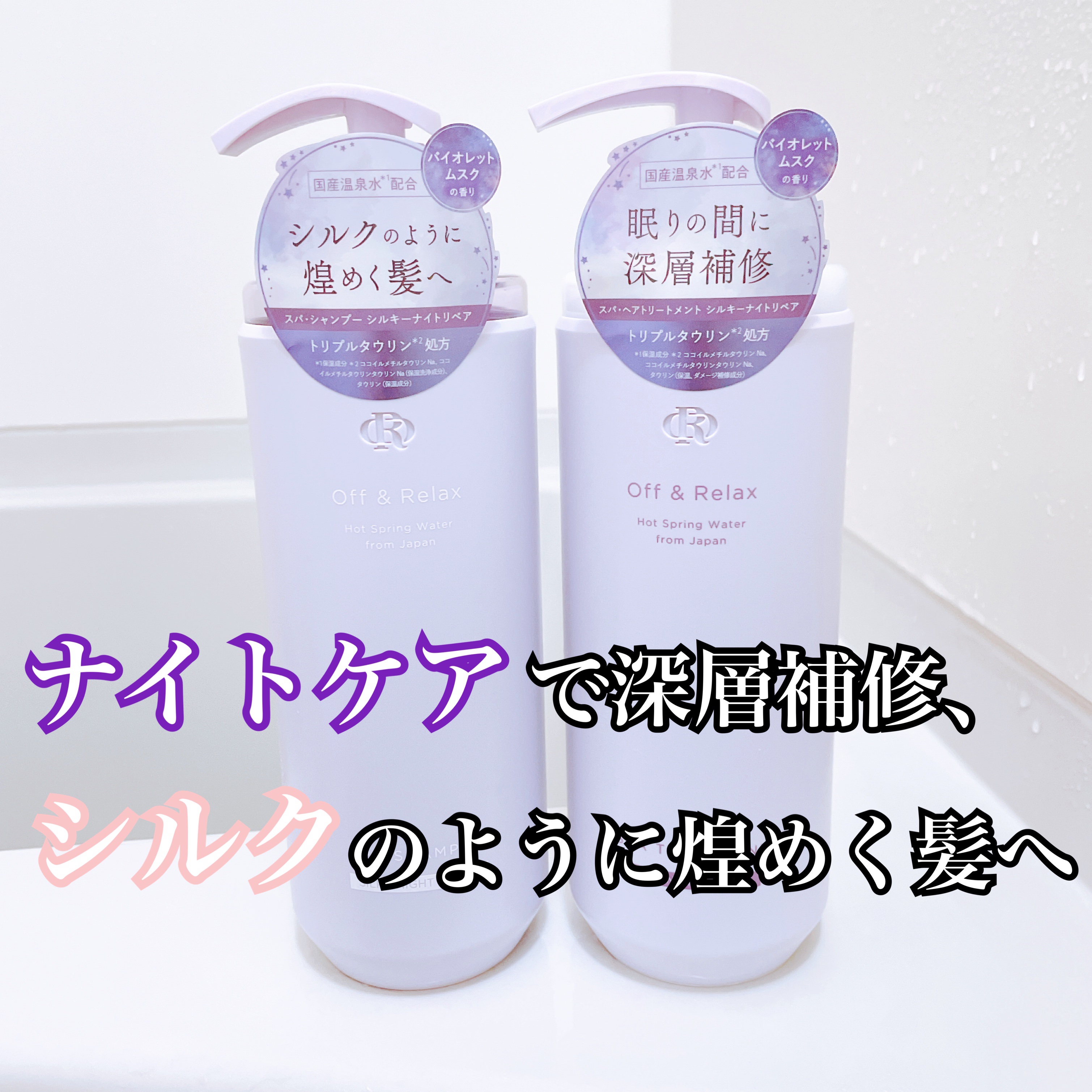 眠りの間に深層補修、シルクのように煌めく髪へ✨ Off&Relaxさんのシルキーナイトリペアシリーズはパサつき、寝ぐせとの関係性に着目した夜の髪美容🎵 独自のトリプルタウリン処方で髪と頭皮の汚れを優しく洗浄🤍 それから日本3か所の温泉水も配合していて、うるおいをキープしながら皮脂や汚れをキレイに落としてくれるのも大きな特長‼️ 独自のヒートプロテクトテクノロジーが髪を紫外線やドライヤーなどの熱ダメージから守ってくれて、髪を労わる5大保湿成分配合で、乾燥知らずな髪へ🎵