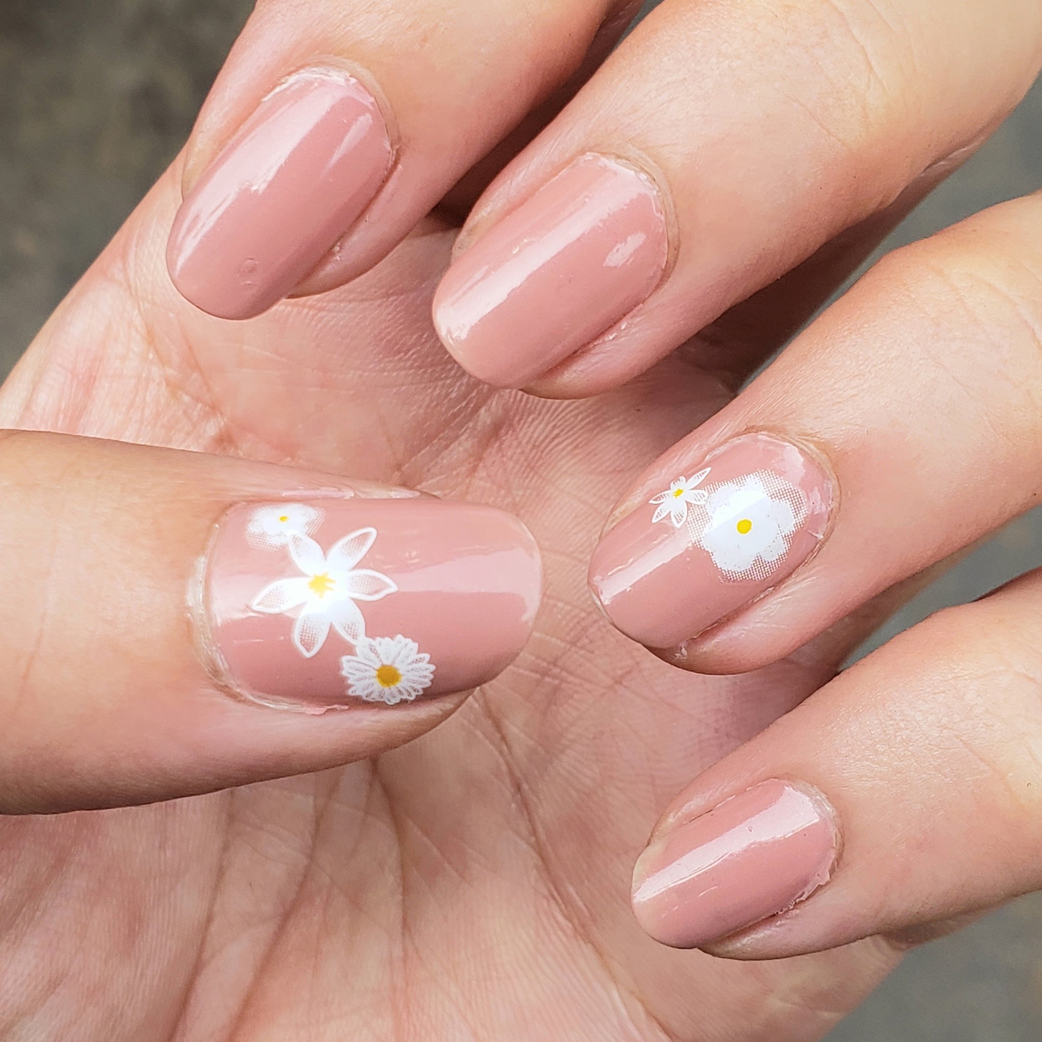 セルフネイルのネイルデザイン - 今日は、素爪偽装のピンクに白いお花で清楚系ネイルを目指してみた。
