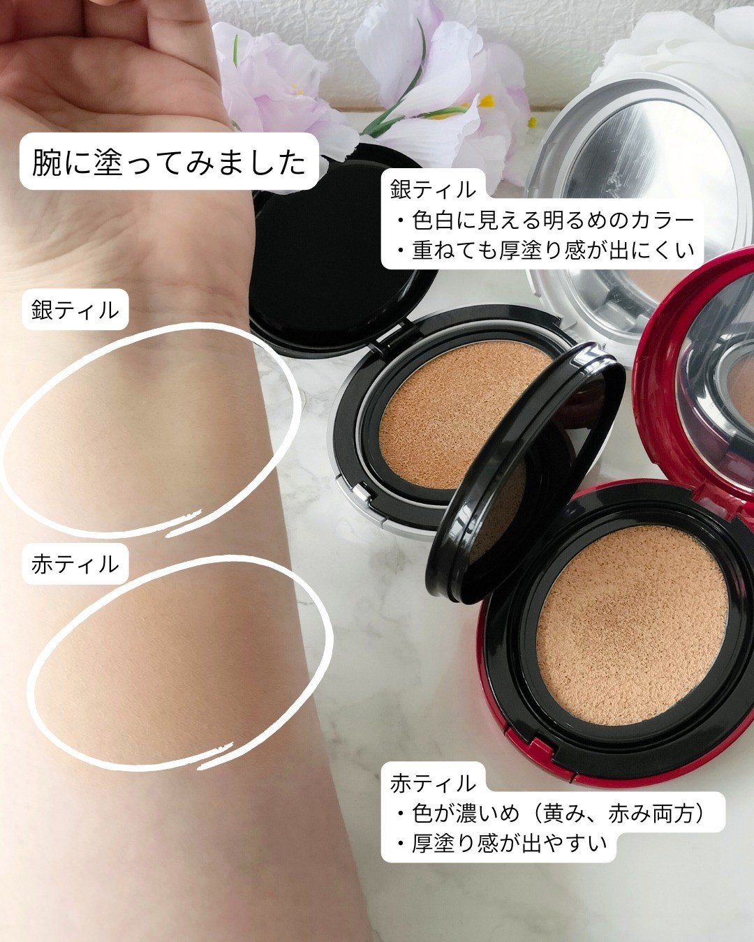赤ティルの方がSPF値が高いです。まだまだ紫外線が気になるので SPF値が高い方が安心感はあります。 オーラクッション: ・色白に見える明るめのカラー ・重ねても厚塗り感が出にくい レッドクッション: ・色が濃いめ ・気をつけて塗らないと 厚塗り感が出やすい レッドクッションは厚塗り感出ちゃいますが オーラクッションはナチュラル感が残っています。 ファンデは明るめカラーが好きなのと 厚塗り感が出にくいので オーラクッションが使いやすいかなと思います。