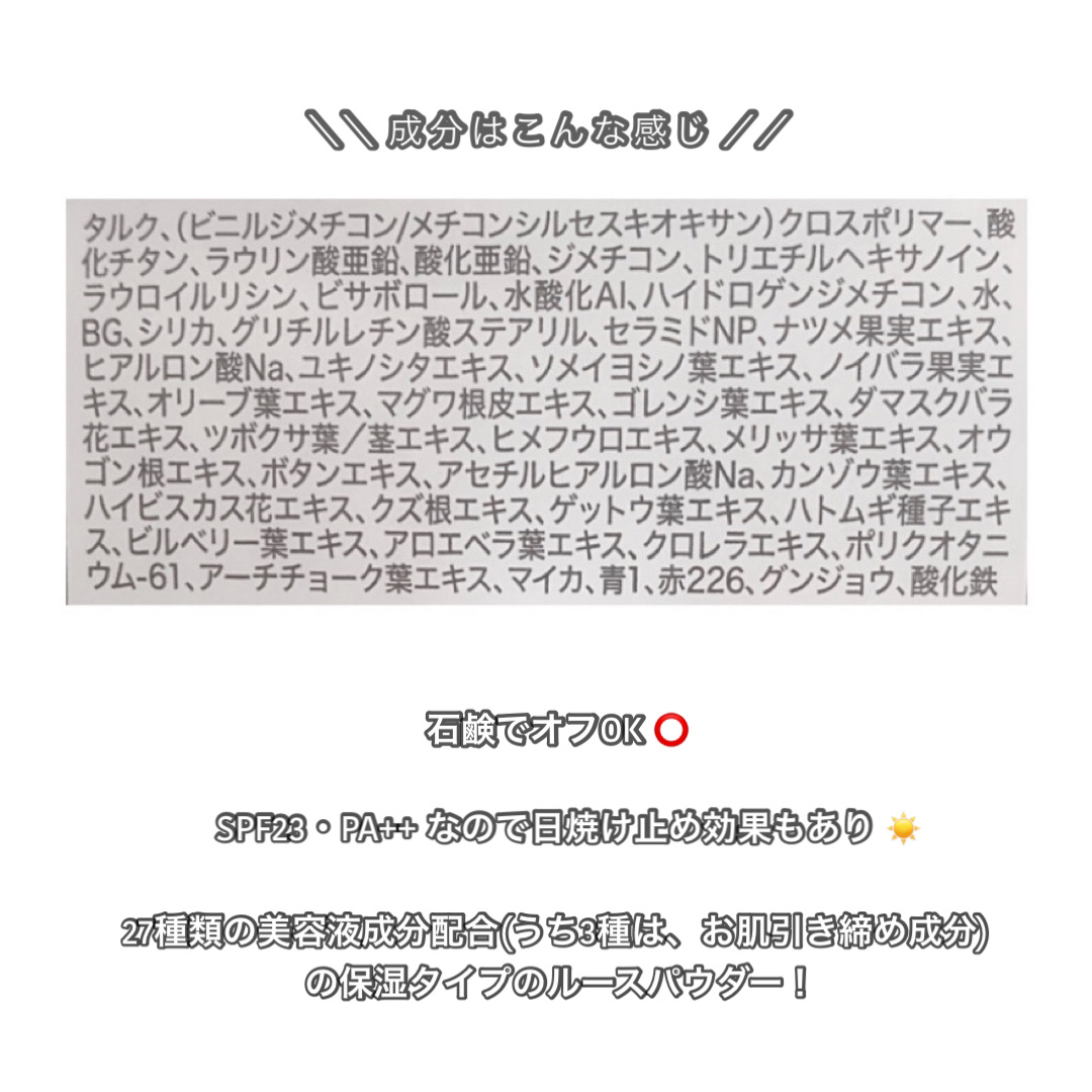 - 素肌キレイ見え!シルク肌仕上がり! 乾燥による化粧崩れを防ぐ、保湿ルースパウダー 石けんでオフOK(単品使用時)、SPF23・PA++、 27種の美容液成分配合(うち3種は、お肌引き締め成分)の 保湿タイプのルースパウダー。 塗った瞬間、まるでシルクのヴェールをまとったようなサラサラのお肌に…♡
