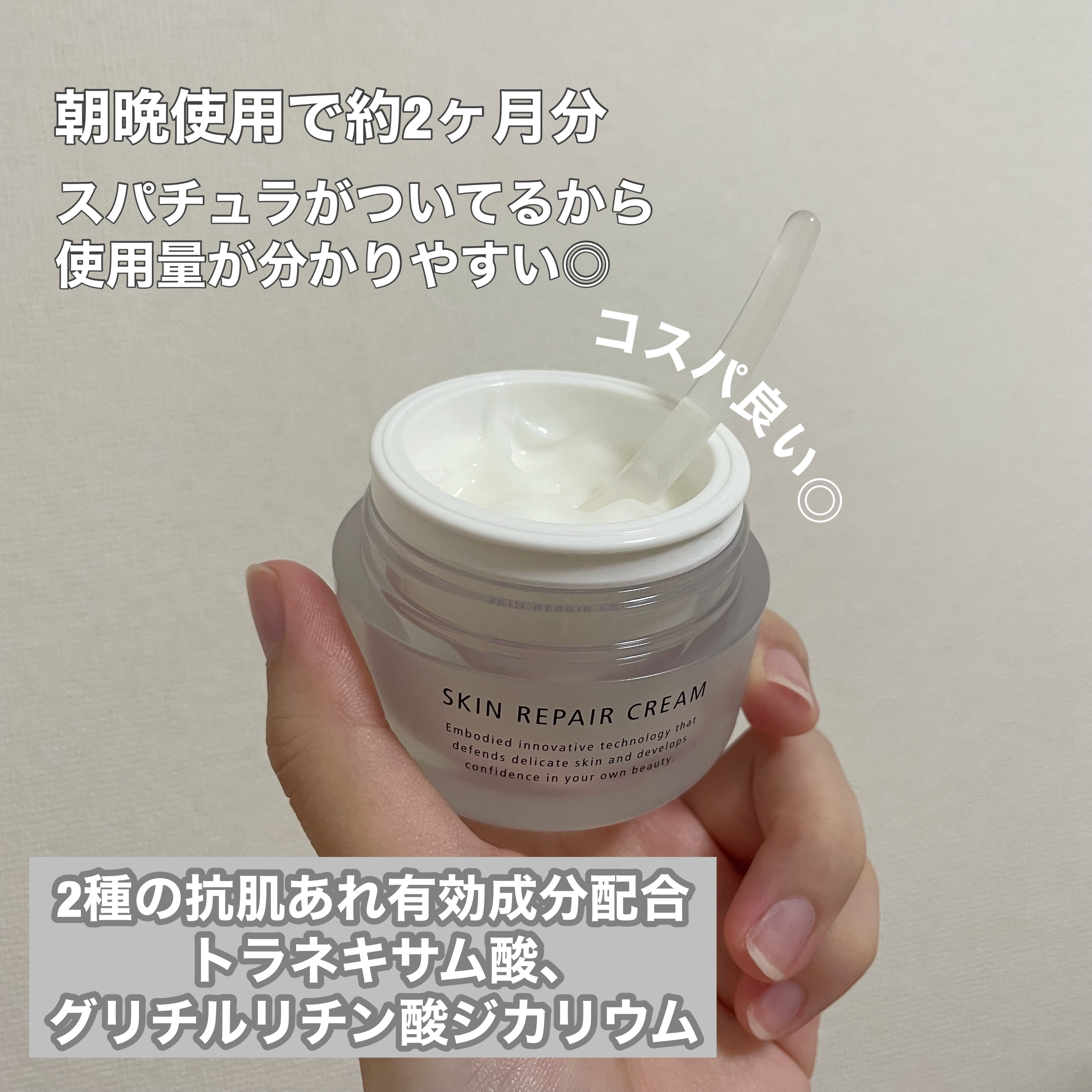 - 【医薬部外品】 薬用肌荒れ予防ケア。 肌荒れ?あわてる前に早めのリペアクリーム。 くり返しがちな肌荒れが気になる方に。 肌荒れ予防ケアとうるおい密封。 たっぷりのうるおいを与え、しっとりなめらかな美肌へ導くクリーム。 角層の深部にうるおいを閉じ込め、肌表面はべたつかず、まるでうるおいの蓋をしたようなしっとり感が続きます。 乾燥による小ジワ*1を目立たなくします。 スパチュラ付き。 ●厳選成分配合、クリーン製法 ●パラベン(防腐剤)フリー、アルコール(エチルアルコール)フリー ●無香料、無着色、弱酸性 ●低刺激設計。敏感肌の方のご協力によるパッチテスト済み*2 ●スティンギングテスト済み*2 ●朝・夜の化粧水の後、スパチュラにパール粒1コ分を目安にとり、顔全体にやさしくなじませます。 (乳液や美容液などをご使用の場合は、お手入れの最後にお使いください。) ●かさつきや乾燥が気になる部分には重ねづけしてください。 ●とくにデリケートな部分にお使いになるときは、肌を強くこすらないよう、軽くおさえるようにしてなじませます。 *1効能評価試験済 *2すべての方にアレルギーや皮ふ刺激がおきないわけではありません