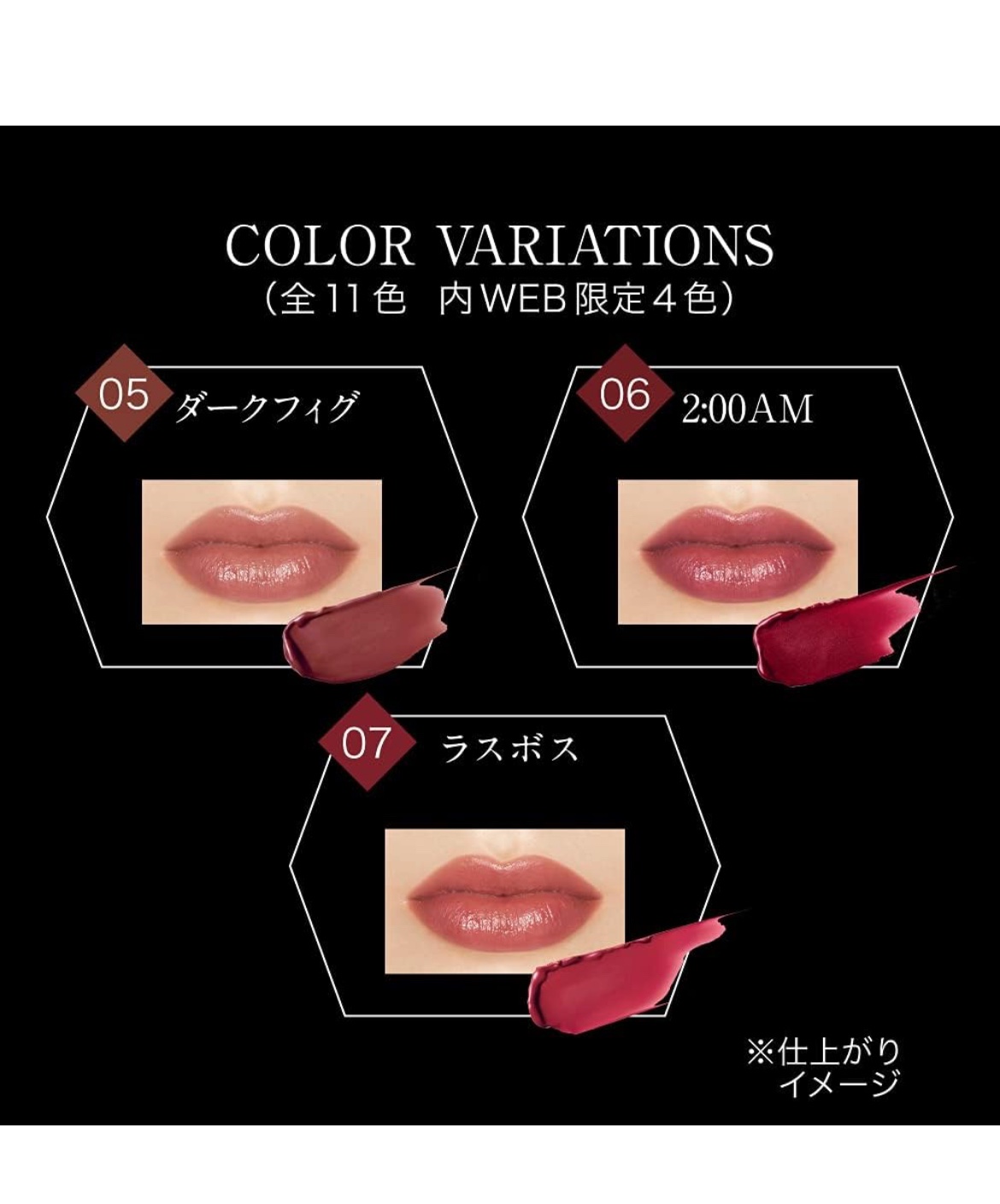 - <01 欲望の塊> テトライソステアリン酸ジペンタエリスリチル、トリ(カプリル酸/カプリン酸)グリセリル、オクチルドデカノール、ラウロイルグルタミン酸ジ(フィトステリル/オクチルドデシル)、ビスアルキル(C16-18)グリセリルウンデシルジメチコン、イソノナン酸イソトリデシル、水添ポリイソブテン、ラウロイルグルタミン酸ジ(オクチルドデシル/フィトステリル/ベヘニル)、パラフィン、合成ワックス、ダイマージリノール酸(フィトステリル/イソステアリル/セチル/ステアリル/ベヘニル)、マイクロクリスタリンワックス、水添マイクロクリスタリンワックス、ヒドロキシステアリン酸エチルヘキシル、トコフェロール、ホホバ種子油、オリーブ果実油、アーモンド油、(エチレン/プロピレン)コポリマー、ポリエチレン、ジメチコン、(+/-)(チタン/酸化チタン)焼結物、マイカ、ラウロイルアスパラギン酸Na、ラウロイルリシン、塩化亜鉛、酸化チタン、酸化鉄、水酸化Al、硫酸Ba、トリイソステアリン酸イソプロピルチタン、酸化スズ、ホウケイ酸(Ca/Al)、合成フルオロフロゴパイト、黄4、黄5、赤104(1)、赤201、赤202 <02 ピンクバナナ> テトライソステアリン酸ジペンタエリスリチル、トリ(カプリル酸/カプリン酸)グリセリル、オクチルドデカノール、ラウロイルグルタミン酸ジ(フィトステリル/オクチルドデシル)、ビスアルキル(C16-18)グリセリルウンデシルジメチコン、イソノナン酸イソトリデシル、水添ポリイソブテン、ラウロイルグルタミン酸ジ(オクチルドデシル/フィトステリル/ベヘニル)、パラフィン、合成ワックス、ダイマージリノール酸(フィトステリル/イソステアリル/セチル/ステアリル/ベヘニル)、マイクロクリスタリンワックス、水添マイクロクリスタリンワックス、ヒドロキシステアリン酸エチルヘキシル、トコフェロール、ホホバ種子油、オリーブ果実油、アーモンド油、(エチレン/プロピレン)コポリマー、ポリエチレン、ジメチコン、(+/-)(チタン/酸化チタン)焼結物、マイカ、ラウロイルアスパラギン酸Na、ラウロイルリシン、塩化亜鉛、酸化チタン、酸化鉄、水酸化Al、硫酸Ba、トリイソステアリン酸イソプロピルチタン、酸化スズ、ホウケイ酸(Ca/Al)、合成フルオロフロゴパイト、黄4、黄5、赤104(1)、赤201、赤202 <03 陽炎> テトライソステアリン酸ジペンタエリスリチル、トリ(カプリル酸/カプリン酸)グリセリル、オクチルドデカノール、ラウロイルグルタミン酸ジ(フィトステリル/オクチルドデシル)、ビスアルキル(C16-18)グリセリルウンデシルジメチコン、イソノナン酸イソトリデシル、水添ポリイソブテン、ラウロイルグルタミン酸ジ(オクチルドデシル/フィトステリル/ベヘニル)、パラフィン、合成ワックス、ダイマージリノール酸(フィトステリル/イソステアリル/セチル/ステアリル/ベヘニル)、マイクロクリスタリンワックス、水添マイクロクリスタリンワックス、ヒドロキシステアリン酸エチルヘキシル、トコフェロール、ホホバ種子油、オリーブ果実油、アーモンド油、(エチレン/プロピレン)コポリマー、ポリエチレン、ジメチコン、(+/-)(チタン/酸化チタン)焼結物、マイカ、ラウロイルアスパラギン酸Na、ラウロイルリシン、塩化亜鉛、酸化チタン、酸化鉄、水酸化Al、硫酸Ba、トリイソステアリン酸イソプロピルチタン、酸化スズ、ホウケイ酸(Ca/Al)、合成フルオロフロゴパイト、黄4、黄5、赤104(1)、赤201、赤202 <04 パンプキンワイン> テトライソステアリン酸ジペンタエリスリチル、トリ(カプリル酸/カプリン酸)グリセリル、オクチルドデカノール、ラウロイルグルタミン酸ジ(フィトステリル/オクチルドデシル)、ビスアルキル(C16-18)グリセリルウンデシルジメチコン、イソノナン酸イソトリデシル、水添ポリイソブテン、ラウロイルグルタミン酸ジ(オクチルドデシル/フィトステリル/ベヘニル)、パラフィン、合成ワックス、ダイマージリノール酸(フィトステリル/イソステアリル/セチル/ステアリル/ベヘニル)、マイクロクリスタリンワックス、水添マイクロクリスタリンワックス、ヒドロキシステアリン酸エチルヘキシル、トコフェロール、ホホバ種子油、オリーブ果実油、アーモンド油、(エチレン/プロピレン)コポリマー、ポリエチレン、ジメチコン、(+/-)(チタン/酸化チタン)焼結物、マイカ、ラウロイルアスパラギン酸Na、ラウロイルリシン、塩化亜鉛、酸化チタン、酸化鉄、水酸化Al、硫酸Ba、トリイソステアリン酸イソプロピルチタン、酸化スズ、ホウケイ酸(Ca/Al)、合成フルオロフロゴパイト、黄4、黄5、赤104(1)、赤201、赤202 <05 ダークフィグ> テトライソステアリン酸ジペンタエリスリチル、トリ(カプリル酸/カプリン酸)グリセリル、オクチルドデカノール、ラウロイルグルタミン酸ジ(フィトステリル/オクチルドデシル)、ビスアルキル(C16-18)グリセリルウンデシルジメチコン、イソノナン酸イソトリデシル、水添ポリイソブテン、ラウロイルグルタミン酸ジ(オクチルドデシル/フィトステリル/ベヘニル)、
