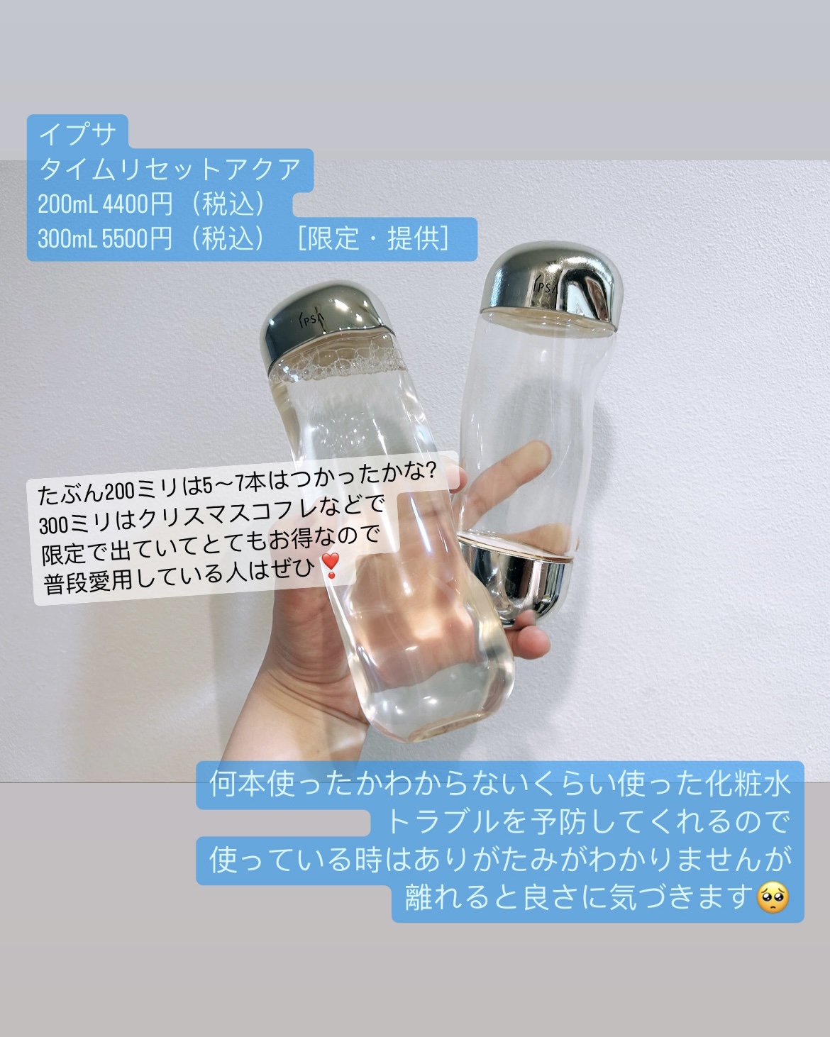 保湿感がしっかりしているので、秋冬メインで使っています! 逆に真夏だとヨレるかも(わたしは真夏は別のものを使います) 真夏でもエアコンの下で乾燥が気になる方にはいいかも! プッシュ式で出し過ぎることもなく、清潔につかえる なによりガラスボトルのパケがかわいい❣️ 最近はハーフサイズがでたようですので、気になる方はぜひ使ってみてください!