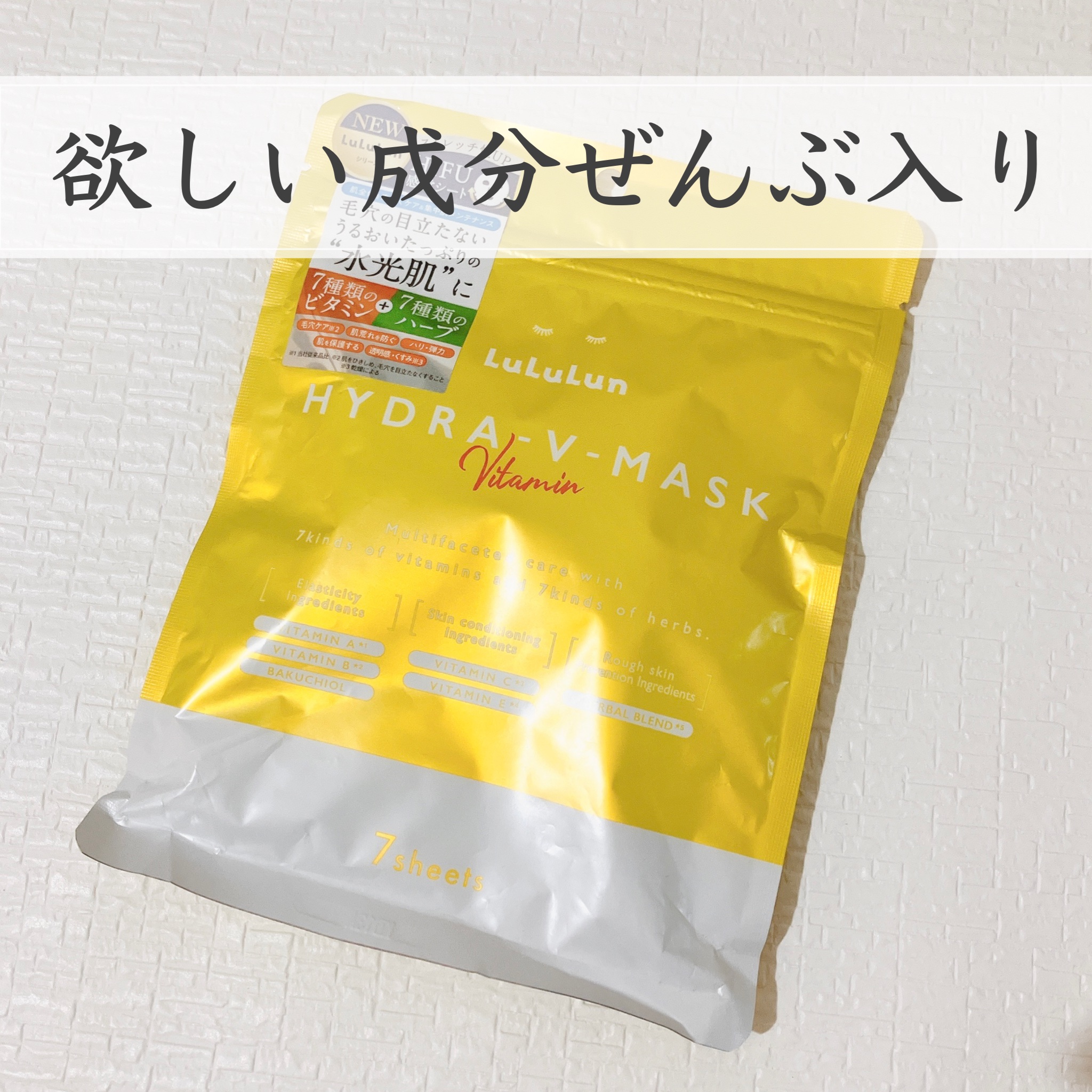 - ルルルンからビタミンたっぷりの化粧水フェイスマスクが新登場。 7種類のビタミン※1と7種類のハーブ※1で肌全体を素早くケア&集中肌メンテナンス。 新開発のフェイスラインに密着するシートで肌を引き締めながら肌のすみずみ※2までうるおいで満たし、毛穴の目立たないうるおいたっぷりの“水光肌”へ。 (※1 全て保湿成分として ※2 角質層まで)