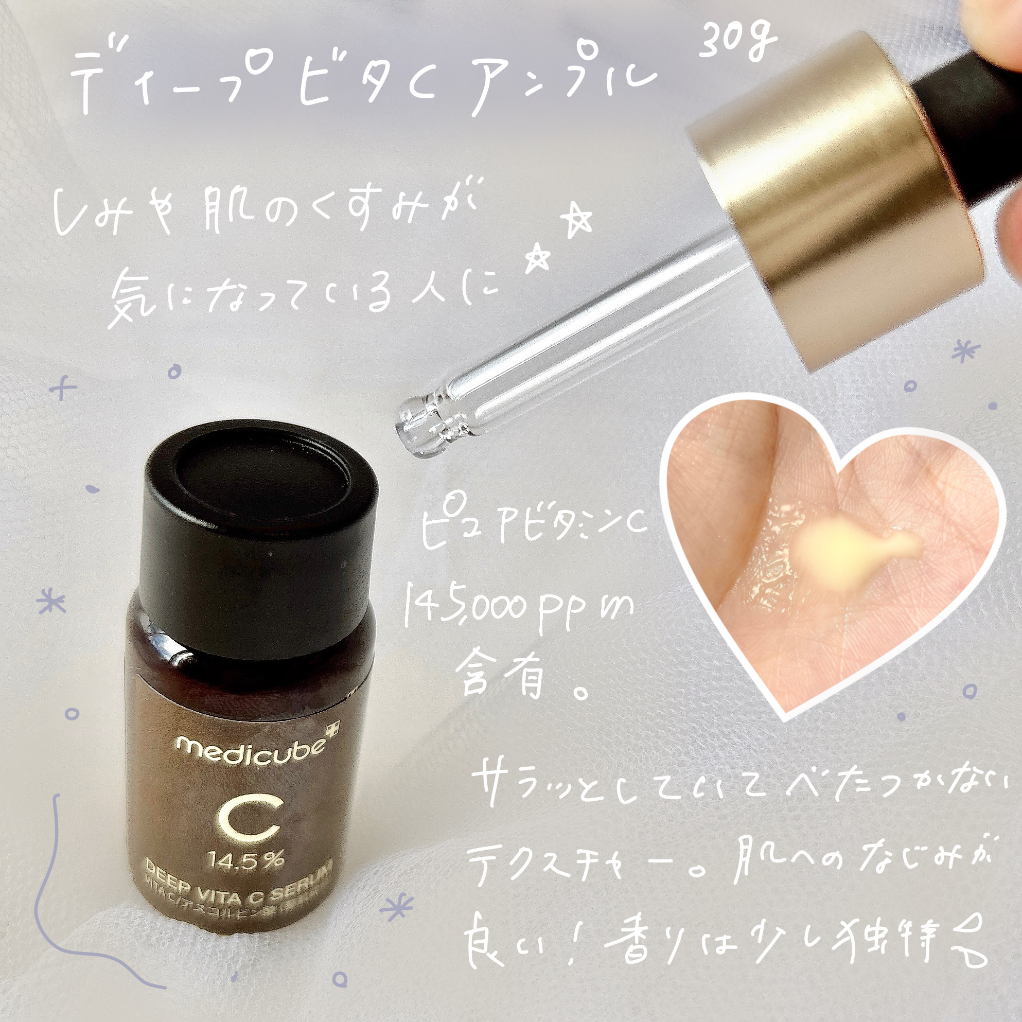 7日間で肌がトーンアップすることが臨床試験で確認されてるんだって😳すごいね‼️そして、美白とシワ改善の2重機能性なの🫶 目に見える表面のシミから、まだ表面に出てきてない内側のシミまで改善🥳💕 ベタつかない高濃縮テクスチャーで肌の内側まで満たしてくれるょ!