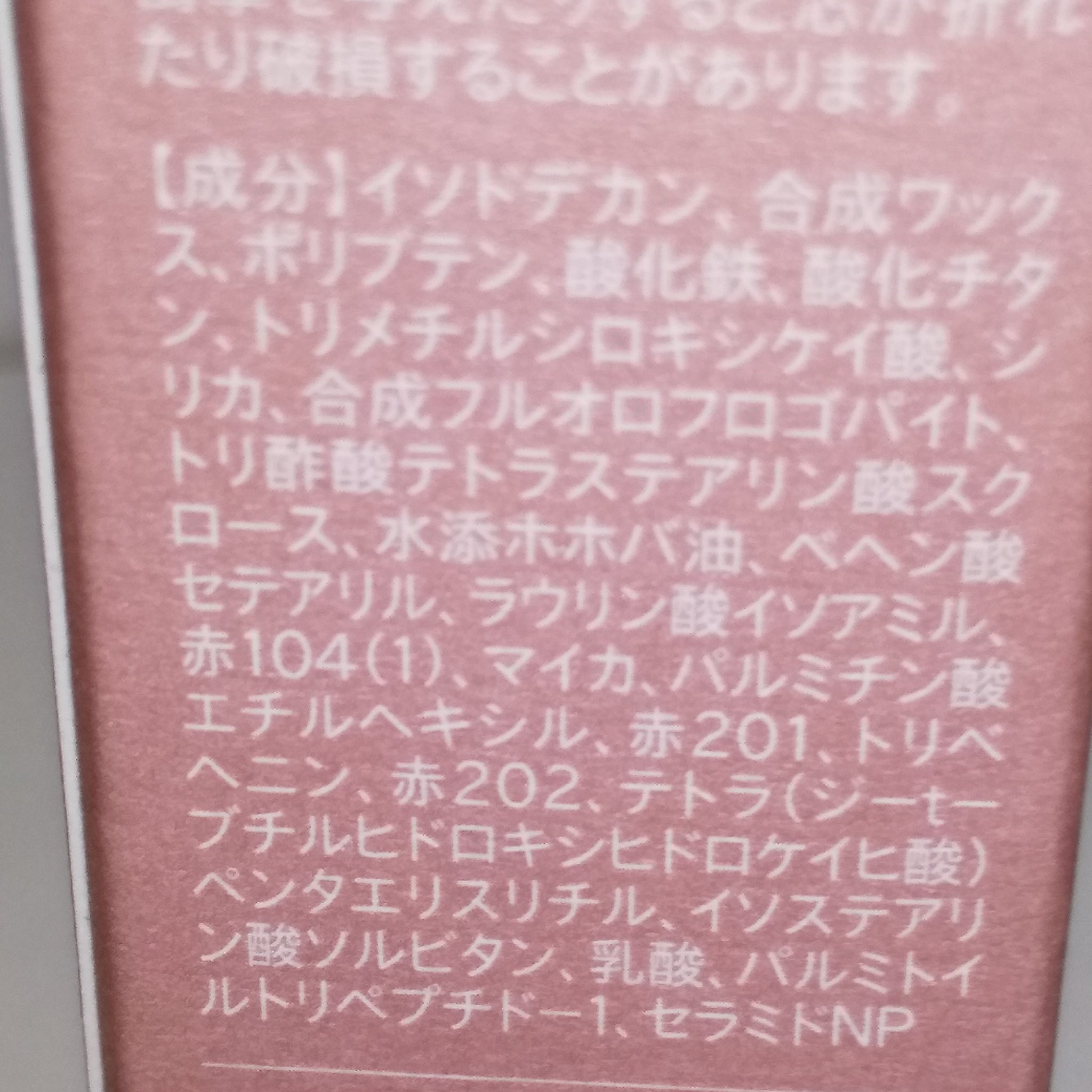 - <01 ギグルベージュ> ビスジグリセリルポリアシルアジペート-2、マイカ、水添ポリ(C6-14オレフィン)、水添ポリデセン、水添ポリイソブテン、酸化チタン、キャンデリラロウ、カルナウバロウ、合成ワックス、シリル化シリカ、水添オリーブ油ステアリルエステルズ、酸化鉄、(カプリル酸/カプリン酸)ヤシアルキル、水添ホホバ油、合成ミツロウ、トリ酢酸パンテニル、テトライソステアリン酸ペンタエリスリチル、オクチルドデカノール、マンガンバイオレット、赤202、テトラ(ジ-t-ブチルヒドロキシヒドロケイヒ酸)ペンタエリスリチル、ニコチン酸トコフェロール、赤201、サリチロイルフィトスフィンゴシン、セラミドNP、ヒアルロン酸Na、水 <02 ベビーローズ> イソドデカン、合成ワックス、ポリブテン、酸化鉄、酸化チタン、トリメチルシロキシケイ酸、シリカ、合成フルオロフロゴパイト、トリ酢酸テトラステアリン酸スクロース、水添ホホバ油、ベヘン酸セテアリル、ラウリン酸イソアミル、赤104(1)、マイカ、パルミチン酸エチルヘキシル、赤201、トリベヘニン、赤202、テトラ(ジ-t-ブチルヒドロキシヒドロケイヒ酸)ペンタエリスリチル、イソステアリン酸ソルビタン、乳酸、パルミトイルトリペプチド-1、セラミドNP <03 ルビーコルセット> ビスジグリセリルポリアシルアジペート-2、水添ポリ(C6-14オレフィン)、水添ポリデセン、水添ポリイソブテン、マイカ、キャンデリラロウ、酸化チタン、酸化鉄、カルナウバロウ、合成ワックス、シリル化シリカ、水添オリーブ油ステアリルエステルズ、赤202、(カプリル酸/カプリン酸)ヤシアルキル、水添ホホバ油、合成ミツロウ、黄4、トリ酢酸パンテニル、テトライソステアリン酸ペンタエリスリチル、オクチルドデカノール、テトラ(ジ-t-ブチルヒドロキシヒドロケイヒ酸)ペンタエリスリチル、ニコチン酸トコフェロール、サリチロイルフィトスフィンゴシン、セラミドNP、ヒアルロン酸Na、水