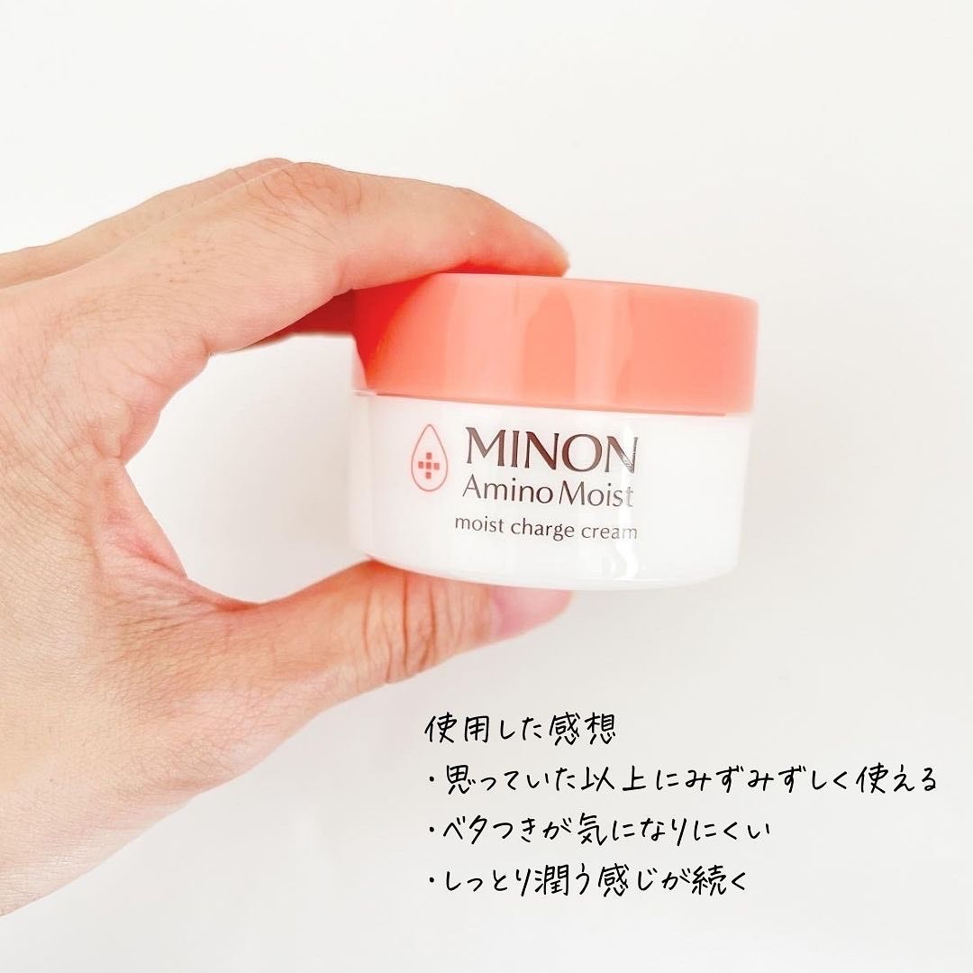 ミノンアミノモイストモイストチャージクリーム¥2,530敏感肌にも使える、こっくりとしたクリーム。朝晩、化粧水と乳液の後に、適量(直径1cm程度)を手のひらに出し顔全体に馴染ませます。こっくりしてるけど、するする伸びました。肌がしっとりして、...