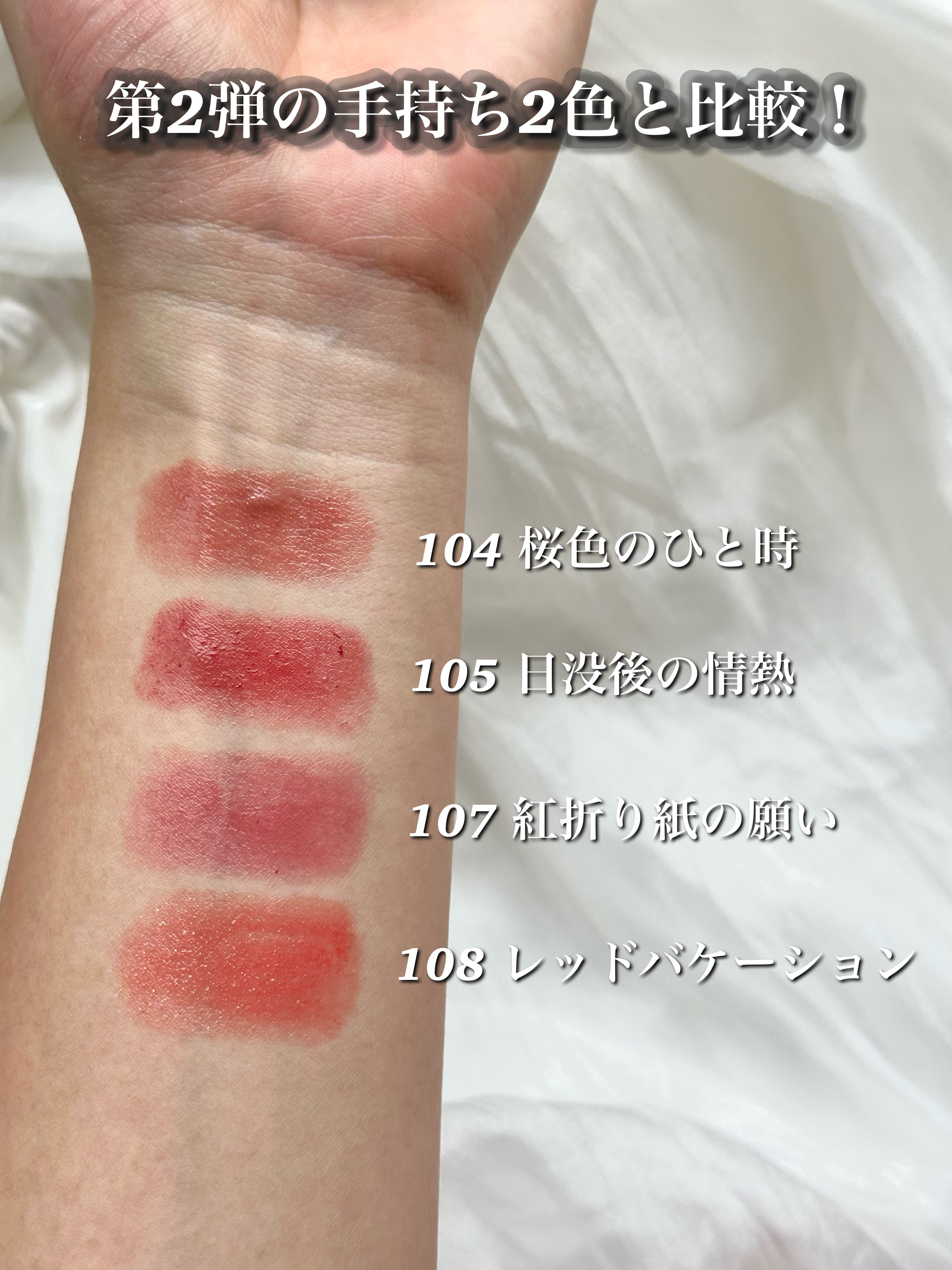 ウォータリーな質感でベタベタせずに塗ることが出来ます♡ただツヤ感もしっかりあってぷるぷるの唇にしてくれるんです! 色持ちもかなりよく、私の唇ではティント特有の蛍光ピンクに変化する感じもなかったです。そしてこれすごいのがツヤ感も持続してくれる!ずっと乾燥しないし、表面の艶感も何かを飲んだりしたくらいでは落ちません! 唇につけるとアプリコットのカラー。名前通りベージュの雰囲気もあり、使いやすいカラーかなと思います! 赤みの入ったコーラルカラーで、血色カラーです。イエベさんに特によく似合うと思います! モテ唇を作ってくれるローズベージュの色味で、果実感を感じます! 名前の通り結構ブラウンです。ただ透け感とぷるぷる感のおかげでとっても使いやすく、落ち着いたメイクにしたいときに本当にぴったりだと思います! イエベ〜ライトスプリングトーンのクリアなピンクコーラル。顔色を明るく見せてくれるカラーです! ローズにムードを一滴加えて、ディープすぎないブリックローズ。ベージュっぽいけどローズみが強めのカラーです!