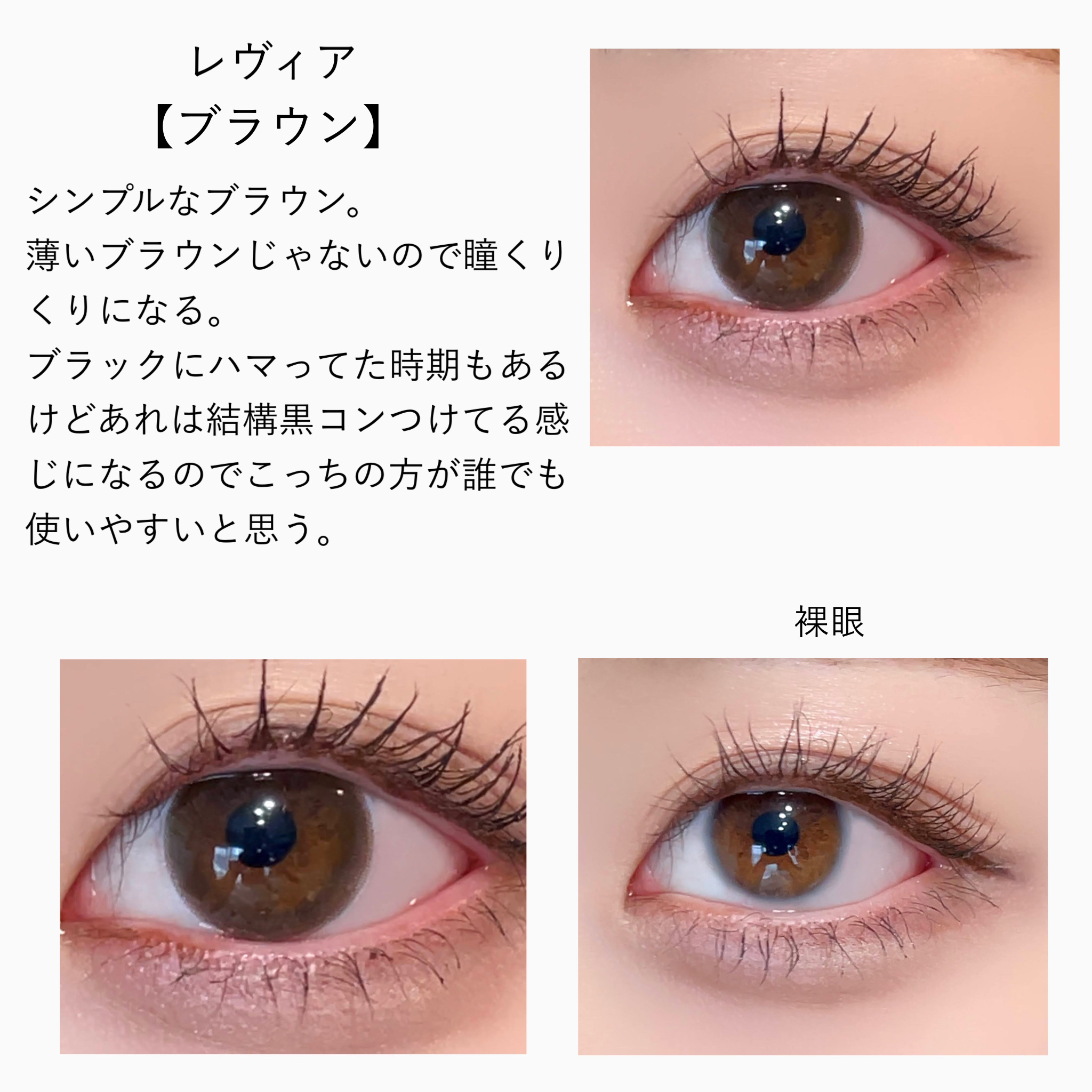 着色13.8mmでやや大きめだけど、極細のふちなのでナチュラルに見える。 レンズのデザインは単体で見ると色んな要素が組み込まれていてかなり複雑。でもつけてみると驚くほど馴染んで、程よく光を取り込んだちゅるんとした瞳になる。 黄みが強すぎないベージュなのでどんなシーンでも使える無難なレンズだなと思った。 ナチュラルだけどしっかり黒目を大きくしたい時にピッタリのレンズ👀