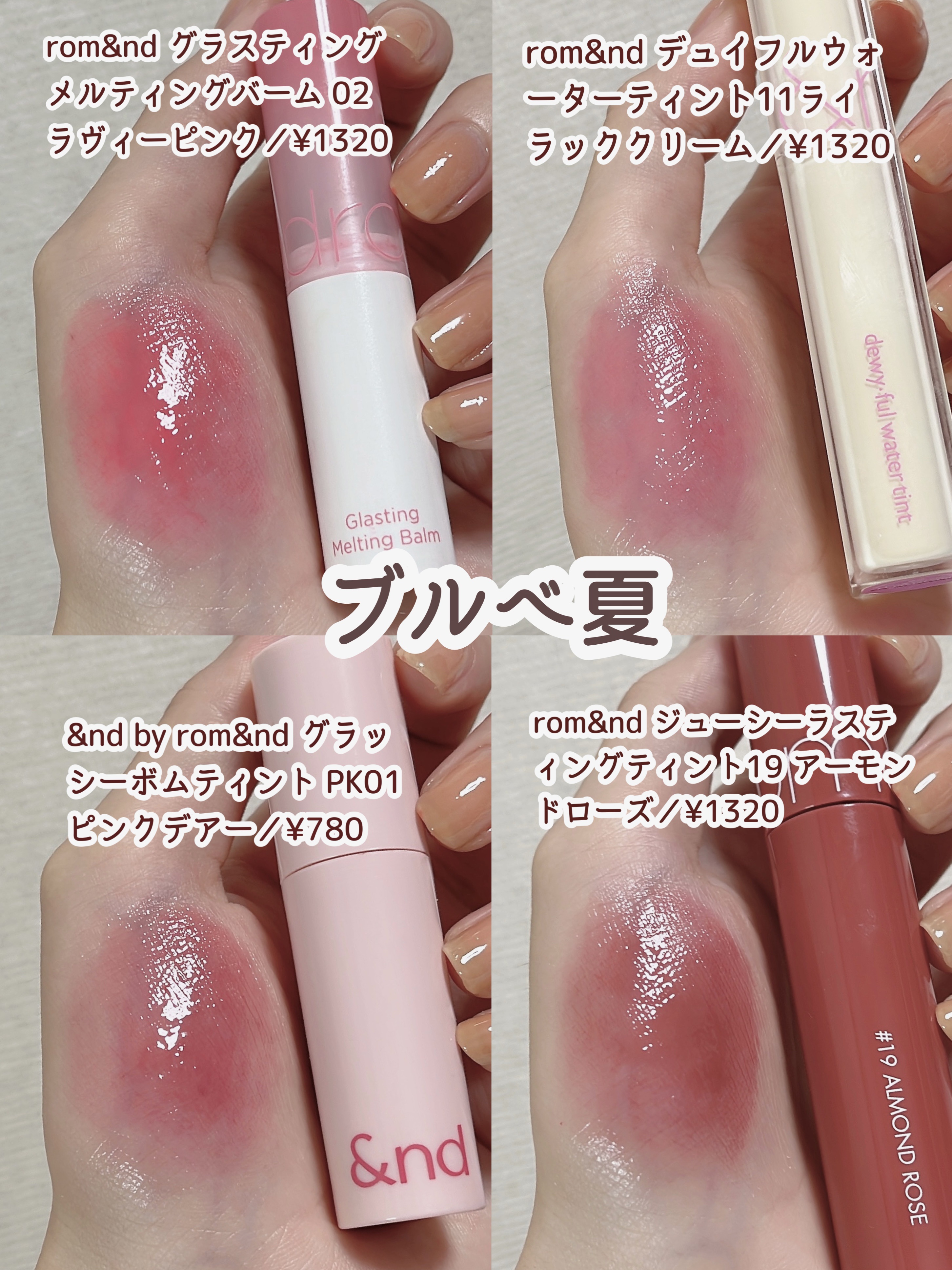 ブルベ夏おすすめカラー🎀 rom&nd ❤︎ ジューシーラスティングティント #06 FIGFIG ¥1,320(税込) デュイフルウォーターティント 06 thulian ¥1,320(税込) グラッシーボムティント BR02 ローズビーン ¥780(税込)
