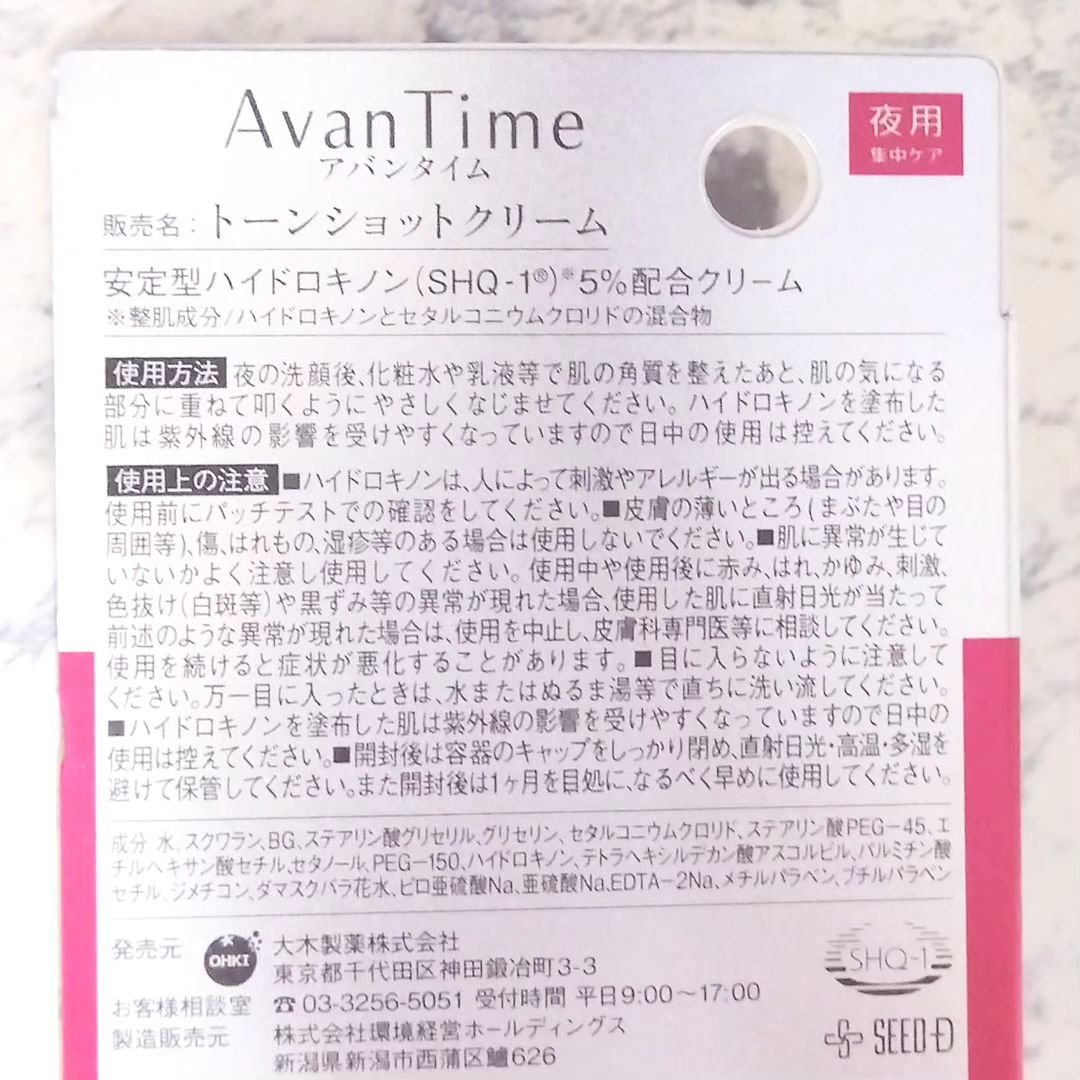 - 「アバンタイム トーンショットクリーム」は安定型ハイドロキノン SHQ-1を5%配合したクリームです。成分が徐々に溶け出しターゲットエリアにアプローチする製品設計であるため、肌にやさしく持続的な作用が期待できます。滑らかで密着しやすいクリームタイプなので、気になる部分を集中的にピンポイントケアすることが可能です。夜のスキンケアの最後に、お肌の気になるポイントにご使用ください。