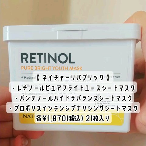 NATUREREPUBLICレチノールピュアブライトユースシートマスク パンテノールハイドラバランスシートマスクプロポリスインテンシブナリシングシートマスク内容量▷▶21枚入り販売価格▶各1,870円(税込)𓈒𓏸𓐍𓂃𓈒𓏸𓂃◌𓈒𓐍𓈒𓈒𓏸𓐍𓂃𓈒𓏸...