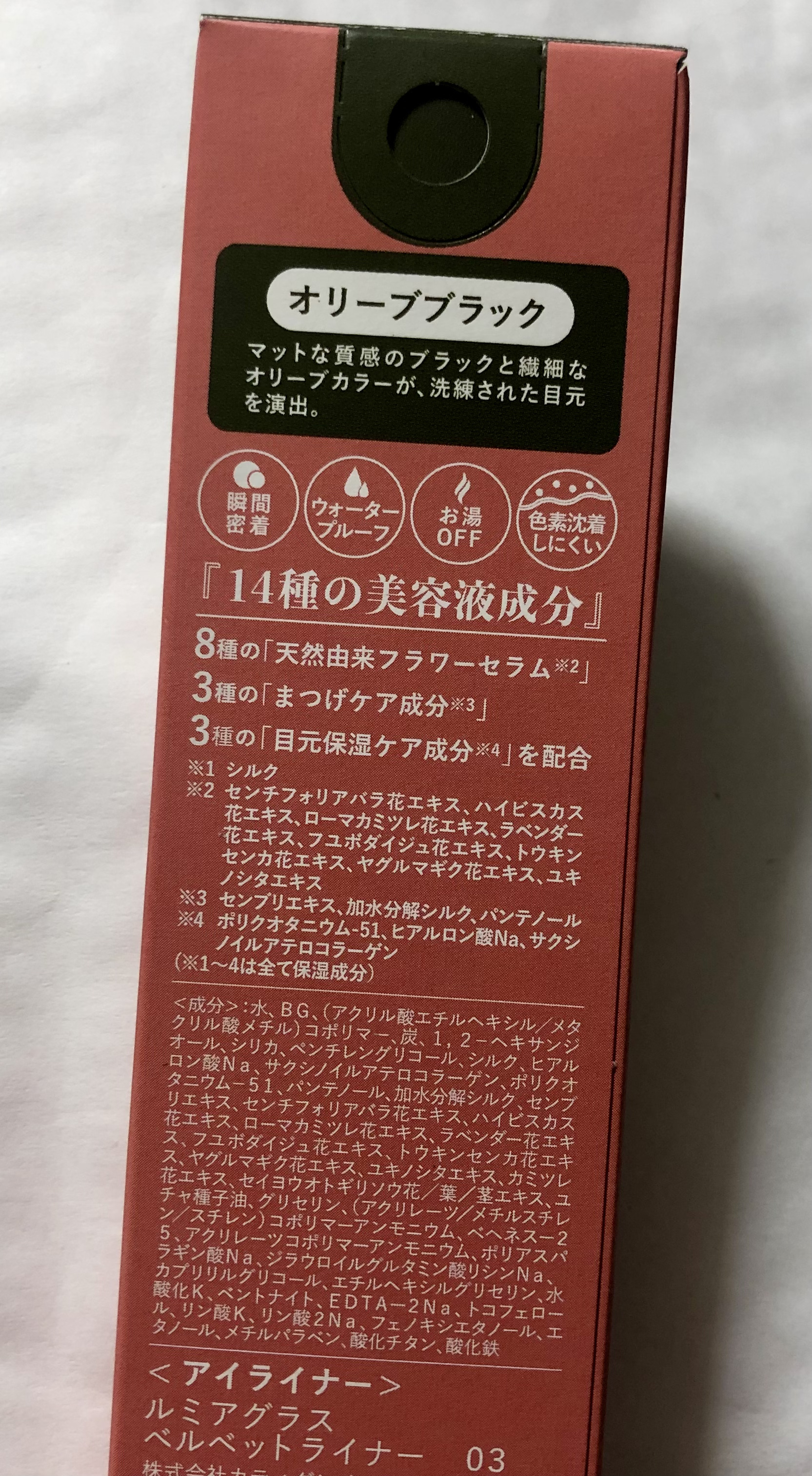 - <01 ブラウンブラック> 水、BG、(アクリル酸エチルヘキシル/メタクリル酸メチル)コポリマー、炭、シリカ、1,2-ヘキサンジオール、シルク、ヒアルロン酸Na、サクシノイルアテロコラーゲン、ポリクオタニウム-51、パンテノール、加水分解シルク、センブリエキス、センチフォリアバラ花エキス、ハイビスカス花エキス、ローマカミツレ花エキス、ラベンダー花エキス、フユボダイジュ花エキス、トウキンセンカ花エキス、ヤグルマギク花エキス、ユキノシタエキス、カミツレ花エキス、セイヨウオトギリソウ花/葉/茎エキス、ユチャ種子油、グリセリン、ペンチレングリコール、(アクリレーツ/メチルスチレン/スチレン)コポリマーアンモニウム、アクリレーツコポリマーアンモニウム、べへネスー30、ポリアスパラギン酸Na、ジラウロイルグルタミン酸リシンNa、カプリリルグリコール、エチルヘキシルグリセリン、水酸化K、EDTAー2Na、ベントナイト、トコフェロール、リン酸K、リン酸2Na、フェノキシエタノール、エタノール、メチルパラベン、酸化チタン、酸化鉄 <02 ボルドーブラック> 水、BG、(アクリル酸エチルヘキシル/メタクリル酸メチル)コポリマー、炭、1,2-ヘキサンジオール、シリカ、ペンチレングリコール、アクリレーツコポリマーアンモニウム、シルク、ヒアルロン酸Na、サクシノイルアテロコラーゲン、ポリクオタニウム-51、パンテノール、加水分解シルク、センブリエキス、センチフォリアバラ花エキス、ハイビスカス花エキス、ローマカミツレ花エキス、ラベンダー花エキス、フユボダイジュ花エキス、トウキンセンカ花エキス、ヤグルマギク花エキス、ユキノシタエキス、カミツレ花エキス、セイヨウオトギリソウ花/葉/茎エキス、ユチャ種子油、グリセリン、(アクリレーツ/メチルスチレン/スチレン)コポリマーアンモニウム、ジラウロイルグルタミン酸リシンNa、カプリリルグリコール、エチルヘキシルグリセリン、水酸化K、ベントナイト、トコフェロール、リン酸K、リン酸2Na、フェノキシエタノール、エタノール、メチルパラベン、赤226、酸化チタン <03 オリーブブラック> 水、BG、(アクリル酸エチルヘキシル/メタクリル酸メチル)コポリマー、炭、1,2-ヘキサンジオール、シリカ、ペンチレングリコール、シルク、ヒアルロン酸Na、サクシノイルアテロコラーゲン、ポリクオタニウム-51、パンテノール、加水分解シルク、センブリエキス、センチフォリアバラ花エキス、ハイビスカス花エキス、ローマカミツレ花エキス、ラベンダー花エキス、フユボダイジュ花エキス、トウキンセンカ花エキス、ヤグルマギク花エキス、ユキノシタエキス、カミツレ花エキス、セイヨウオトギリソウ花/葉/茎エキス、ユチャ種子油、グリセリン、(アクリレーツ/メチルスチレン/スチレン)コポリマーアンモニウム、べへネスー25、アクリレーツコポリマーアンモニウム、ポリアスパラギン酸Na、ジラウロイルグルタミン酸リシンNa、カプリリルグリコール、エチルヘキシルグリセリン、水酸化K、ベントナイト、EDTAー2Na、トコフェロール、リン酸K、リン酸2Na、フェノキシエタノール、エタノール、メチルパラベン、酸化チタン、酸化鉄