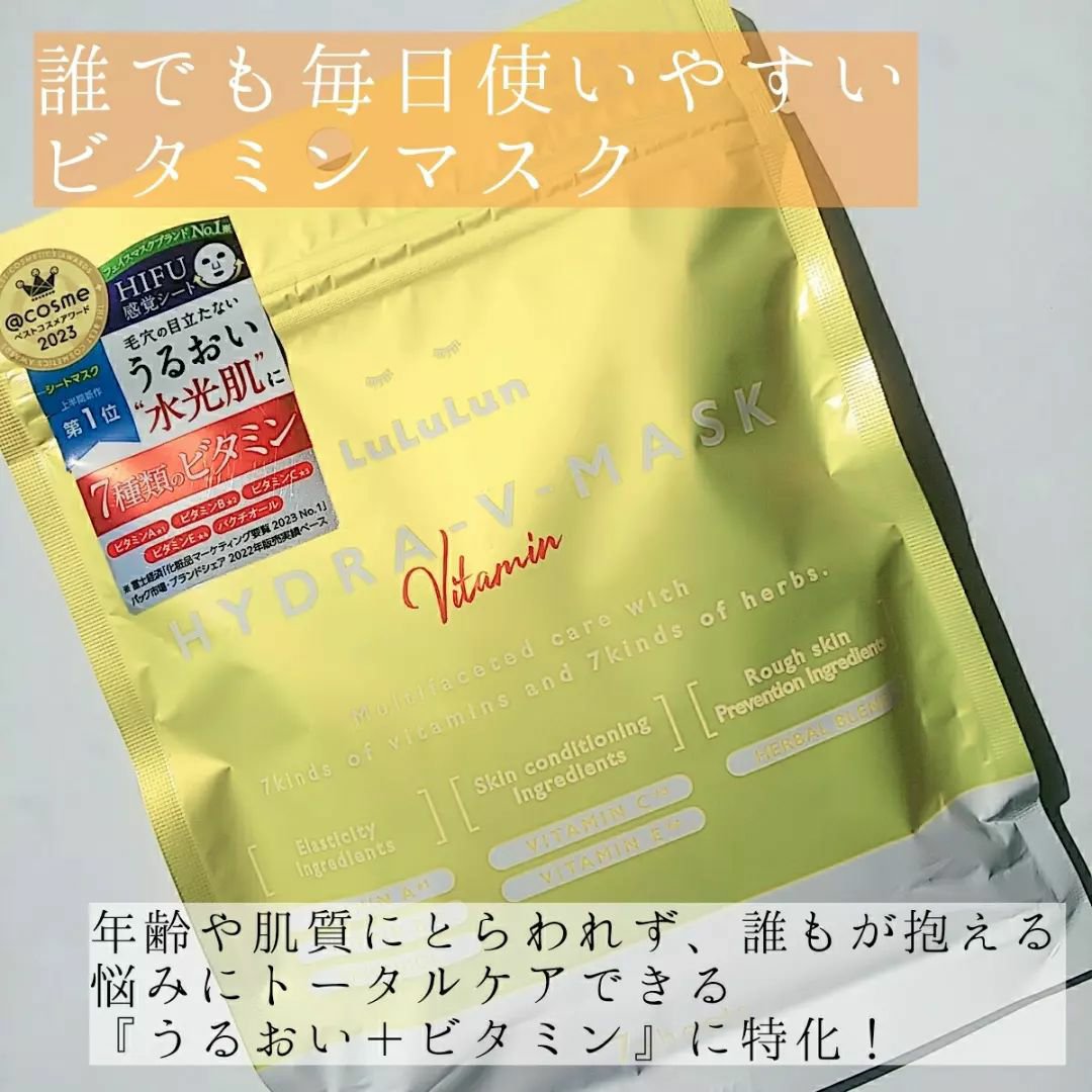 - ルルルンからビタミンたっぷりの化粧水フェイスマスクが新登場。 7種類のビタミン※1と7種類のハーブ※1で肌全体を素早くケア&集中肌メンテナンス。 新開発のフェイスラインに密着するシートで肌を引き締めながら肌のすみずみ※2までうるおいで満たし、毛穴の目立たないうるおいたっぷりの“水光肌”へ。 (※1 全て保湿成分として ※2 角質層まで)