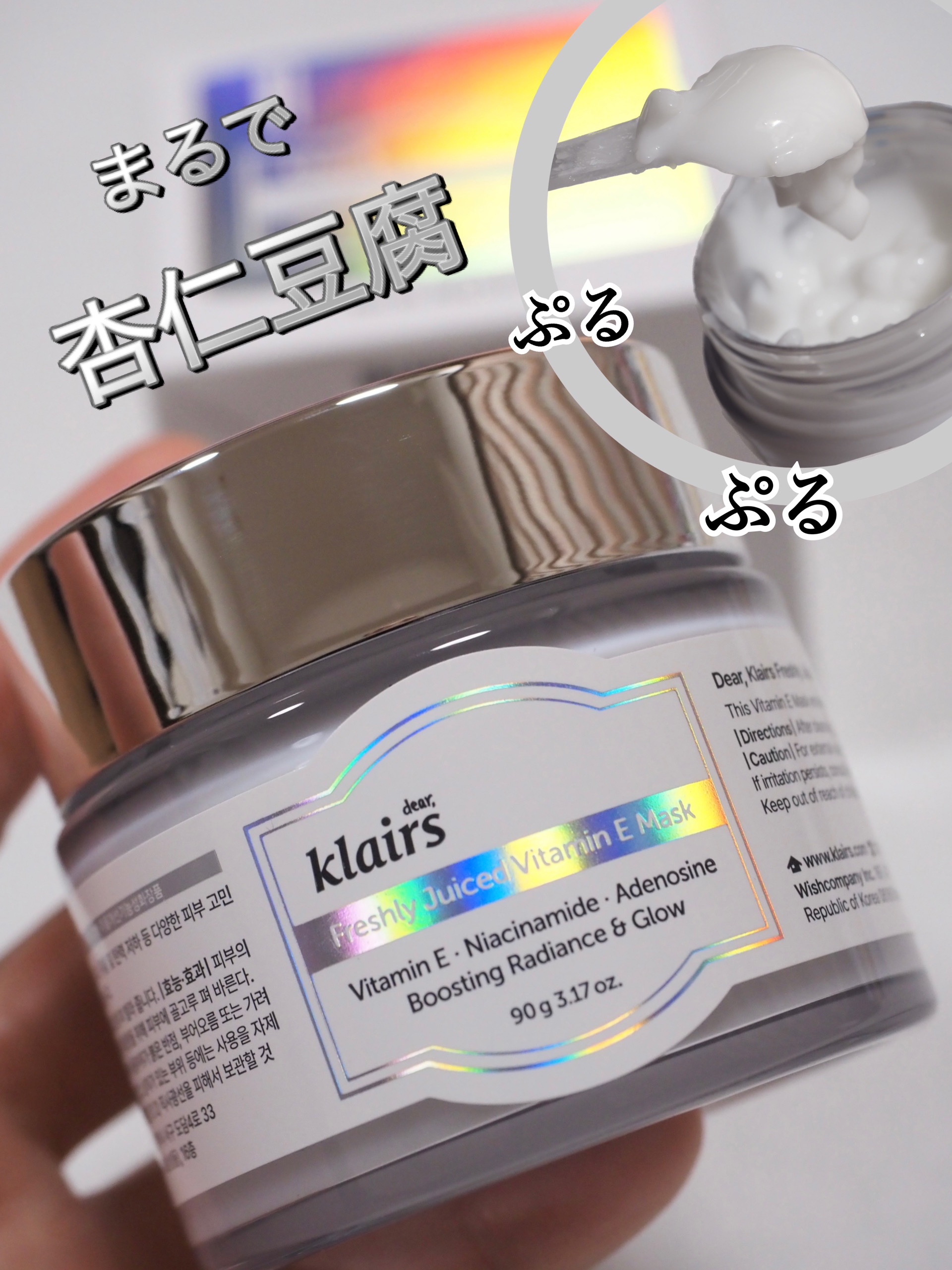 クレアスのフレッシュリージュースドビタミンEマスクは杏仁豆腐のようにぷるぷるとしたゲルクリーム。使う度にクリーム表面が平らになる形状記憶テクスチャーがとっても不思議。 仕上がりの濃密な保湿感はやみつきに。普段使いでは少なめの量を重ねていく塗り方が好きですが、スリーピングマスクとして一気に厚めに塗ってパックするのもオススメ。 抗酸化作用を持つビタミンEはお肌からもぜひ取り入れたい成分!お肌調子がよくない時期こそ使いたくなるクリームです︎︎👍