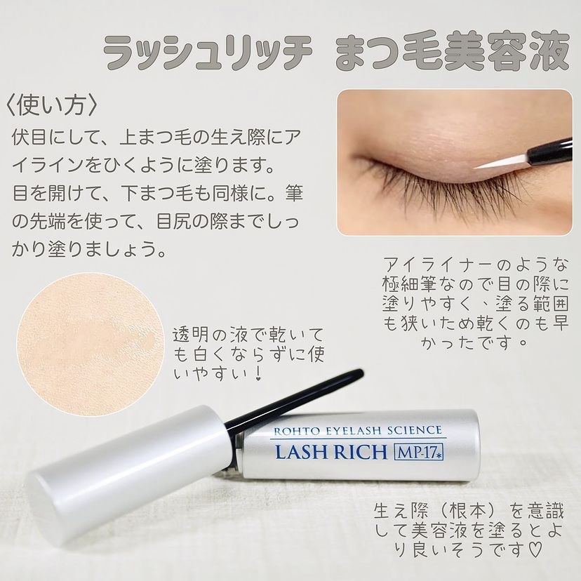 ロート製薬さまからいただきました🖤MP-17*1、コラプラス*2をはじめとする、8種ものうるおい成分*3がたっぷり配合したまつ毛美容液𖠶𖠶ロート製薬ラッシュリッチまつ毛美容液サラッとした美容液だけど垂れにくく、根本から短い毛まで塗りやすい細筆...